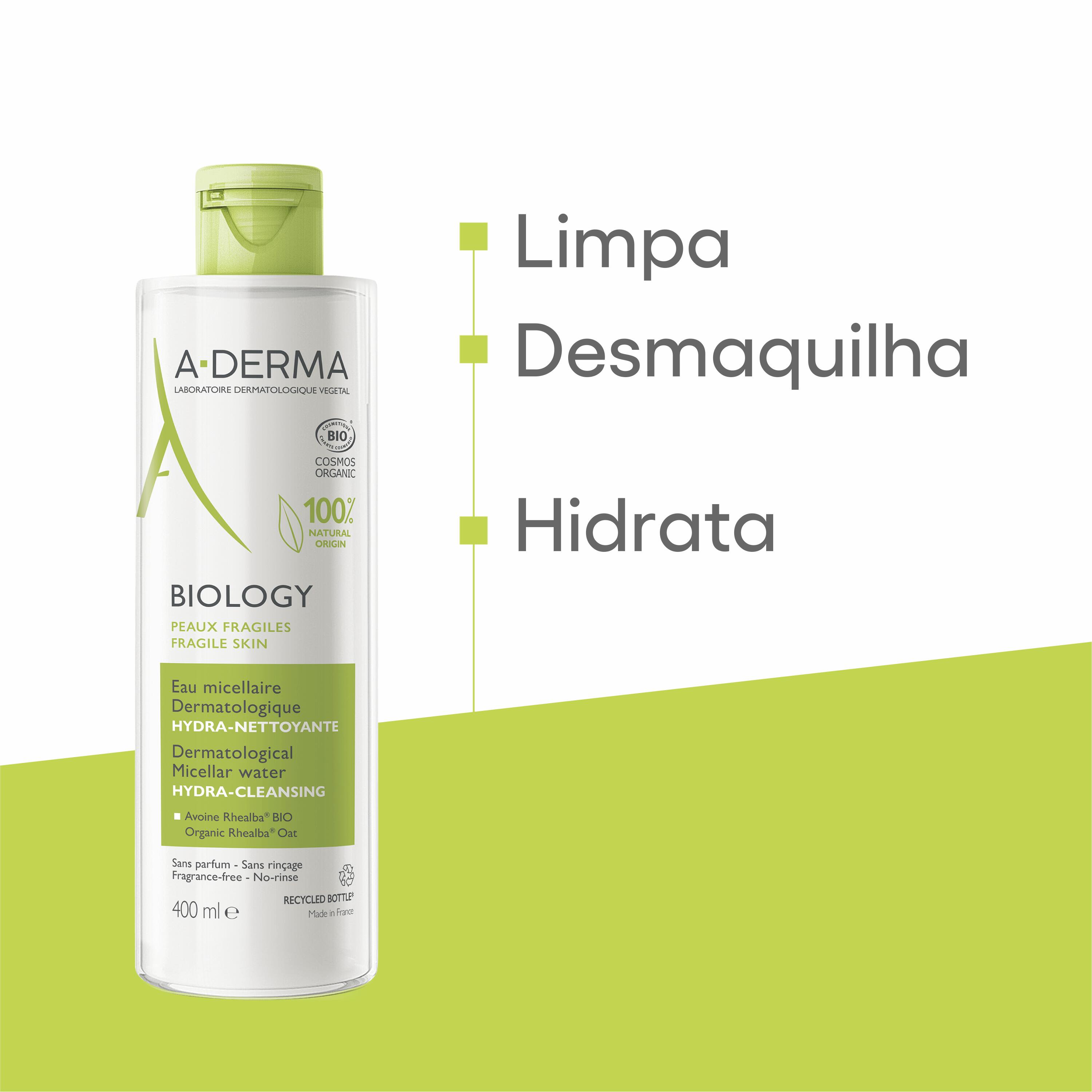 Com a Água micelar dermatológica Hidralimpeza BIOLOGY, a A-DERMA desenvolveu o primeiro desmaquilhante dermatológico com certificação orgânica, que é adequada para todos os tipos de pele frágil do rosto. A sua fórmula inovadora contém o principal ingrediente ativo da gama BIOLOGY, Seiva Biológica de Aveia Rhealba®, conhecida pelas suas propriedades equilibrantes e hidratantes, bem como Extrato de Dente de Leão conhecido pelas suas propriedades antipoluição. Com uma textura fresca não colante, a ÁGUA MICELAR dermatológica sem enxaguar foi testada na pele com tendência alérgica e pode ser utilizada no rosto e na zona dos olhos. Remove a maquilhagem e limpa muito suavemente, hidrata e equilibra a pele frágil. Sem perfume, sem óleo essencial, e não comedogénico, a sua fórmula 100 % natural tem certificação biológica. Com a Água micelar dermatológica BIOLOGY, a A-DERMA oferece à pele sensível um produto de limpeza que contém apenas os ingredientes essenciais para assegurar uma tolerância ótima.