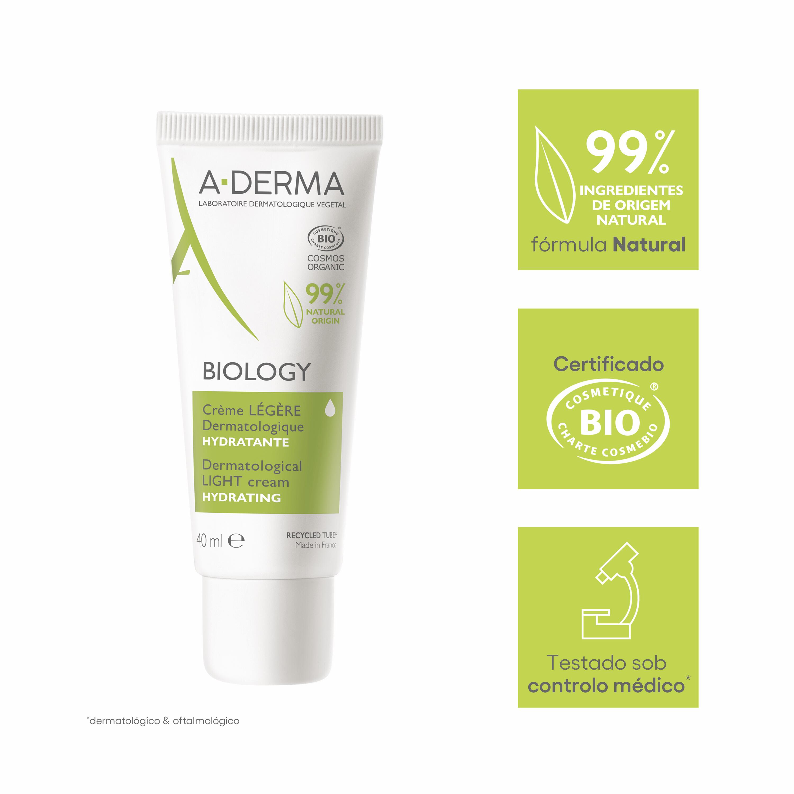 O laboratório dermatológico A-DERMA à base de plantas cuida da pele frágil, normal e mista com um creme Ligeiro hidratante que combina padrões dermatológicos e eficácia com uma certificação biológica. Composto por 99% de ingredientes naturais, o Creme Ligeiro Dermatológico Hidratante BIOLOGY hidrata durante 24 horas¹, equilibra e reforça a ação protetora da barreira cutânea enfraquecida pelos agressores externos (poluição, tabaco, calcário, ar condicionado, stress, etc.). A sua eficácia dermatológica única deve-se a dois dos principais ingredientes ativos da gama A-DERMA BIOLOGY: Seiva Biológica de Aveia Rhealba®*, com as suas propriedades equilibrantes e hidratantes, e o Extrato de Dente de Leão, conhecido pelas suas propriedades antipoluição. Uma excelente base para maquilhagem, a sua textura não comedogénica, fresca e leve pode ser utilizada sozinha ou combinada com outros produtos dermatológicos BIOLOGY para um cuidado de pele à medida, adaptado a cada pele frágil. Testado em pele alérgica, o CREME LIGEIRO contém apenas os ingredientes essenciais para assegurar uma tolerância ótima (sem perfume nem óleo essencial) e pode ser aplicado no rosto e no contorno dos olhos. Perfeitamente hidratada e equilibrada, a pele fica confortável e radiante.