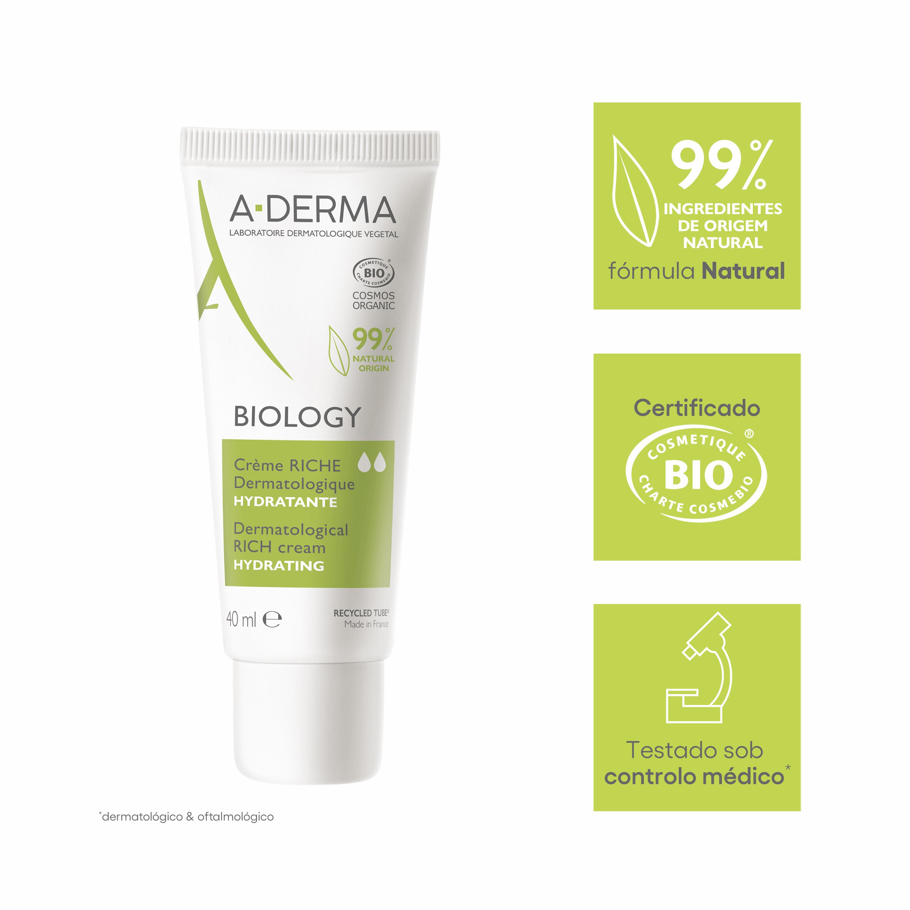 O laboratório dermatológico A-DERMA à base de plantas cuida da pele seca e frágil com um creme rico hidratante que combina padrões dermatológicos e eficácia com uma certificação biológica. Composto por 99% de ingredientes naturais, o CREME RICO DERMATOLÓGICO HIDRATANTE BIOLOGY hidrata durante 24 horas¹, reequilibra e reforça a ação protetora da barreira cutânea enfraquecida pelos agressores externos (poluição, tabaco, calcário, ar condicionado, stress, etc.). A sua eficácia dermatológica única deve-se a dois dos principais ingredientes ativos da gama A-DERMA BIOLOGY: Seiva Biológica de Aveia Rhealba®*, com as suas propriedades equilibrantes e hidratantes, e o Extrato de Dente de Leão, conhecido pelas suas propriedades antipoluição. Uma excelente base para maquilhagem, a sua textura não comedogénica, cremosa e fresca pode ser utilizada sozinha ou combinada com outros produtos dermatológicos BIOLOGY para um tratamento de pele à medida, adaptado a cada pele frágil. Testado em pele com tendência alérgica, o CREME RICO contém apenas os ingredientes essenciais para assegurar uma tolerância ótima (sem perfume nem óleo essencial) e pode ser aplicado no rosto e no contorno dos olhos. Perfeitamente hidratada e reforçada, a pele fica equilibrada, confortável e radiante.