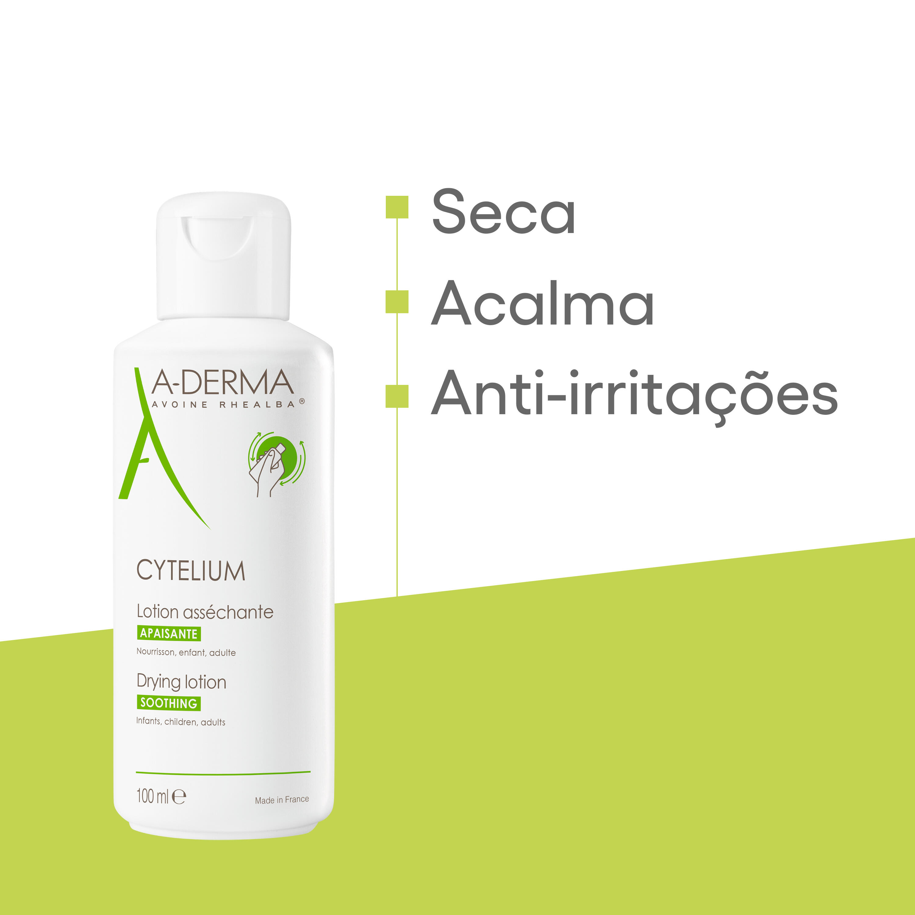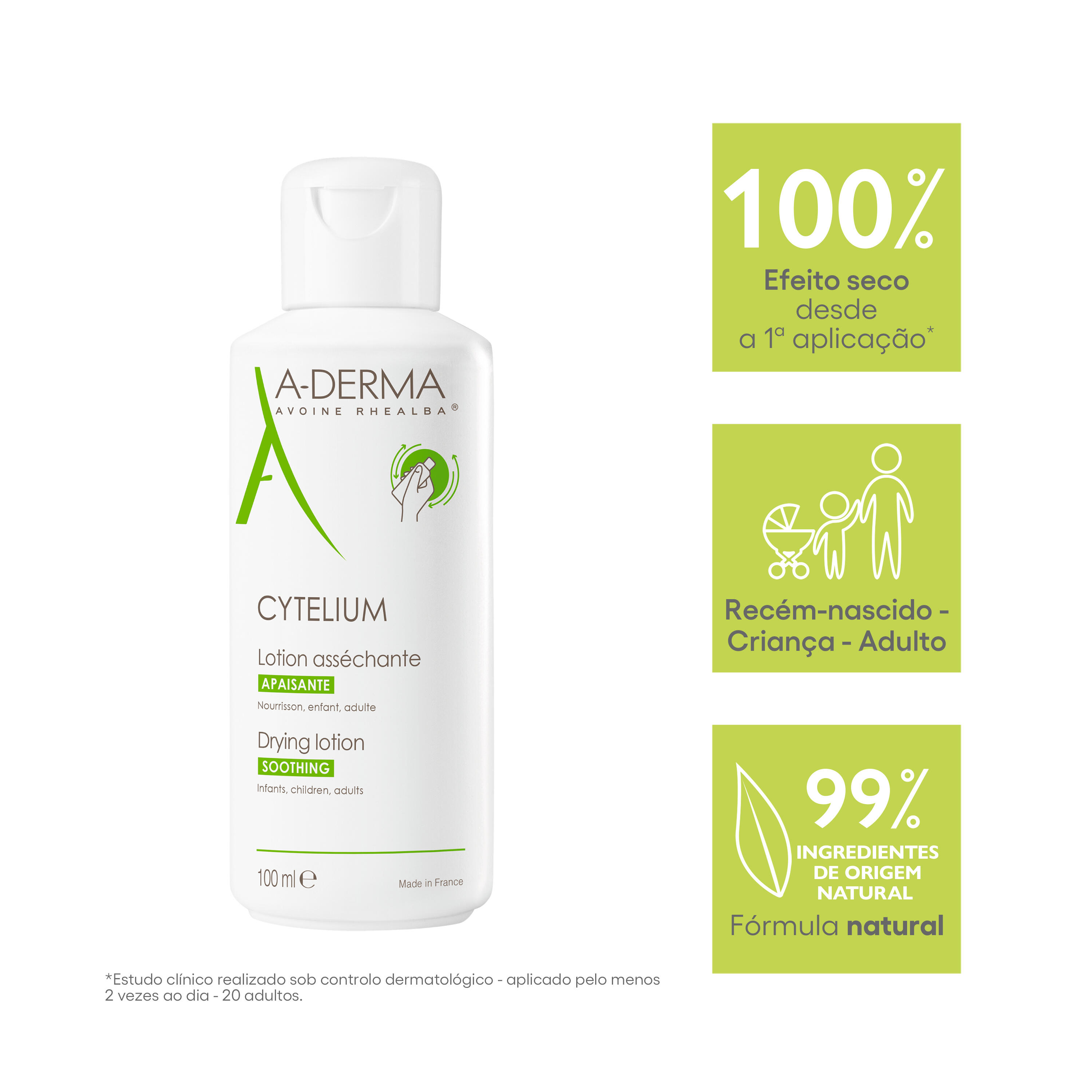 Esta loção tem uma textura leve e aquosa composta apenas por sete ingredientes 99% de origem natural. Seca e suaviza as dobras cutâneas, as zonas íntimas externas, a zona das fraldas e as zonas frágeis sujeitas a maceração, logo após a primeira aplicação e sem deixar resíduos na pele. Um produto não perfumado, natural e de alta tolerância adequado para toda a família, faz da LOÇÃO SECANTE CYTELIUM o produto secante mais popular vendido nas farmácias.* Aveia Rhealba® de agricultura biológica. Informação Vegan: sem ingredientes de origem animal. * IQVIA - Pharmatrend International - Market 83H1 BEAUTY PROD. PARA ACALMAR A PELE. em loções e sprays - em farmácias na Alemanha, Áustria, Bélgica, Espanha, França, Grécia, Itália, Polónia, Portugal, Eslováquia, Suíça e República Checa - 2019 - em volume e valor.