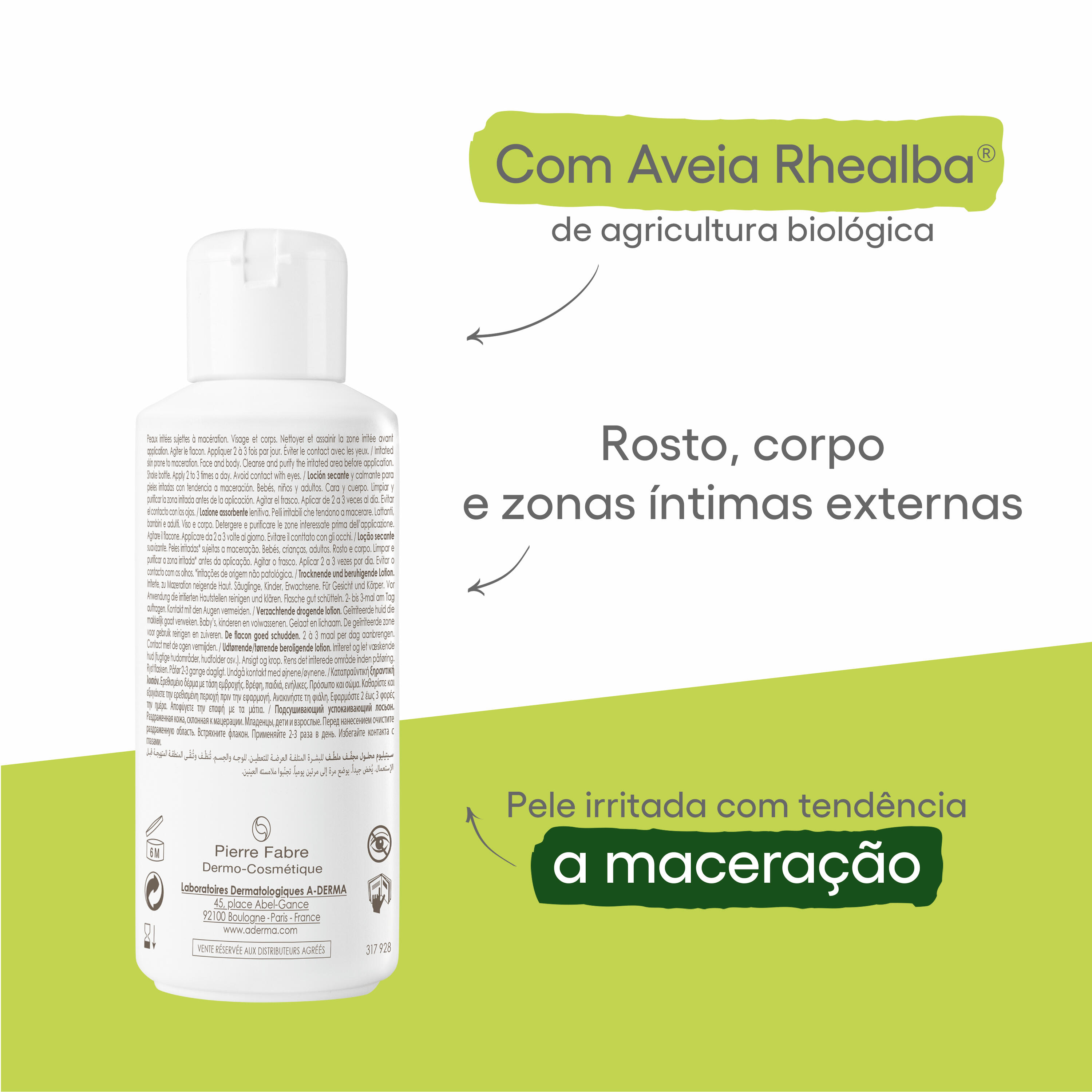 Limpar e purificar a zona irritada* antes da aplicação. *irritações de origem não patológica Agitar bem antes de usar. Aplicar 2 a 3 vezes por dia. Evite o contacto com os olhos.|* IQVIA - Pharmatrend International - Market 83H1 BEAUTY PROD. PARA ACALMAR A PELE. em loções e sprays - em farmácias na Alemanha, Áustria, Bélgica, Espanha, França, Grécia, Itália, Polónia, Portugal, Eslováquia, Suíça e República Checa - 2019 - em volum Corpo|Rosto|Áreas íntimas externas Várias vezes ao dia