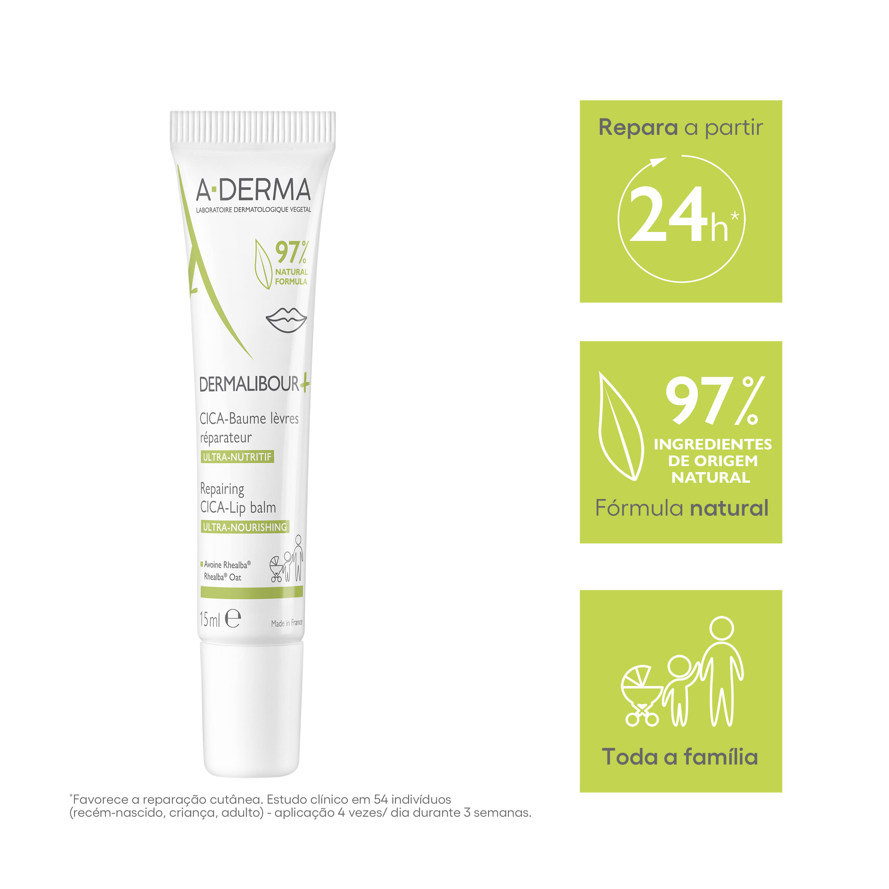 O Bálsamo Lábios Reparador CICA DERMALIBOUR+ acalma, repara* em 24 horas¹ e nutre lábios irritados, secos, gretados e muito secos. Os lábios recuperam conforto e suavidade desde a primeira aplicação. Extrato de Plântulas de Aveia Rhealba®, óleos vegetais e manteigas (jojoba, karité, girassol) : 97% de ingredientes naturais fazem dele o produto para levar consigo para todo o lado, para aliviar imediatamente as sensações de desconforto. Contém também agentes minerais de limpeza (sulfato de zinco, que proporciona um ambiente adequado à regeneração cutânea) e oferece alta resistência à água, um efeito barreira duradouro de 48 horas³ e benefícios imediatos suavizantes. Absorve rapidamente, deixa uma película protetora nos lábios sem qualquer resíduo branco. Testado dermatologicamente e por pediatras, é adequada para toda a família. Não contém perfume nem óleo mineral.