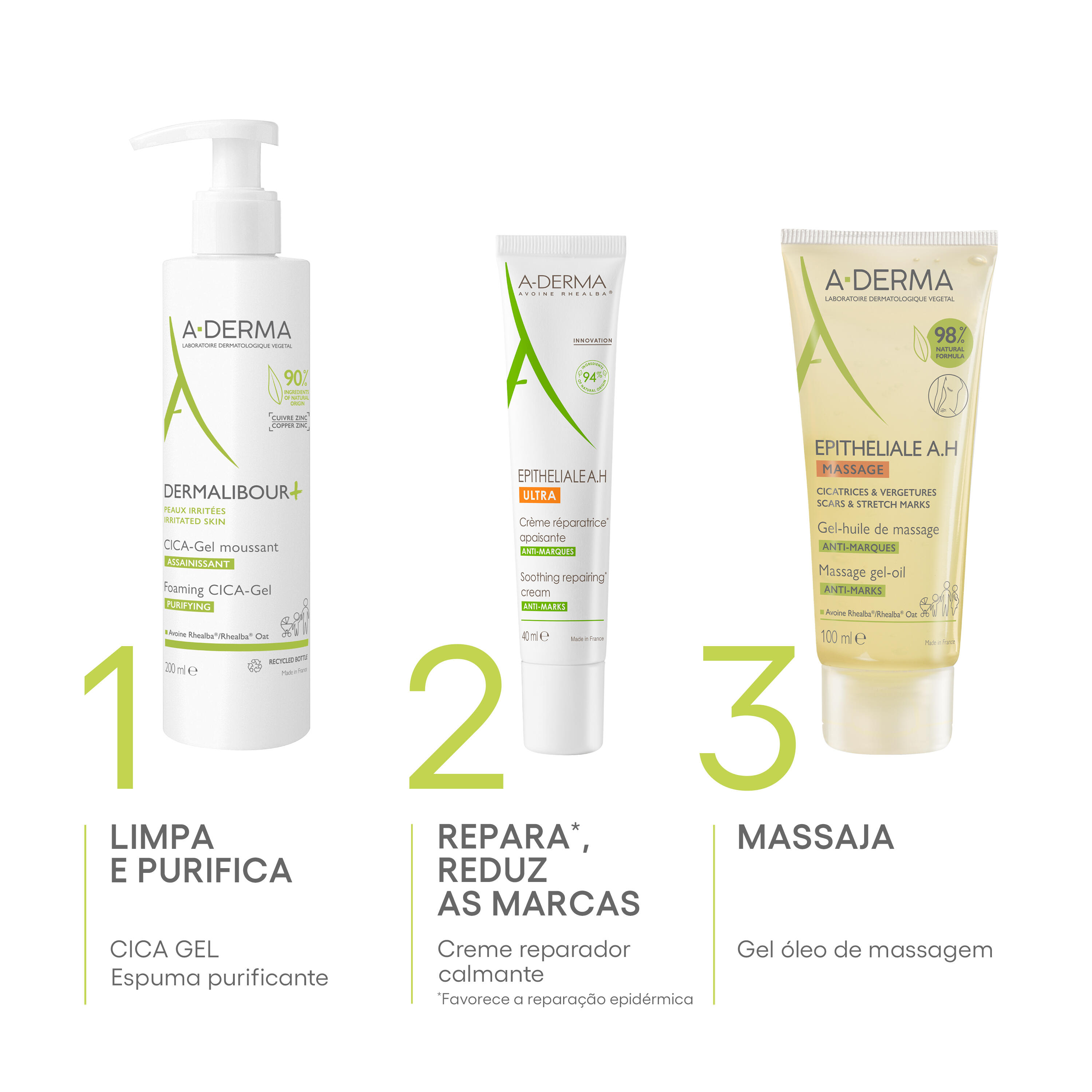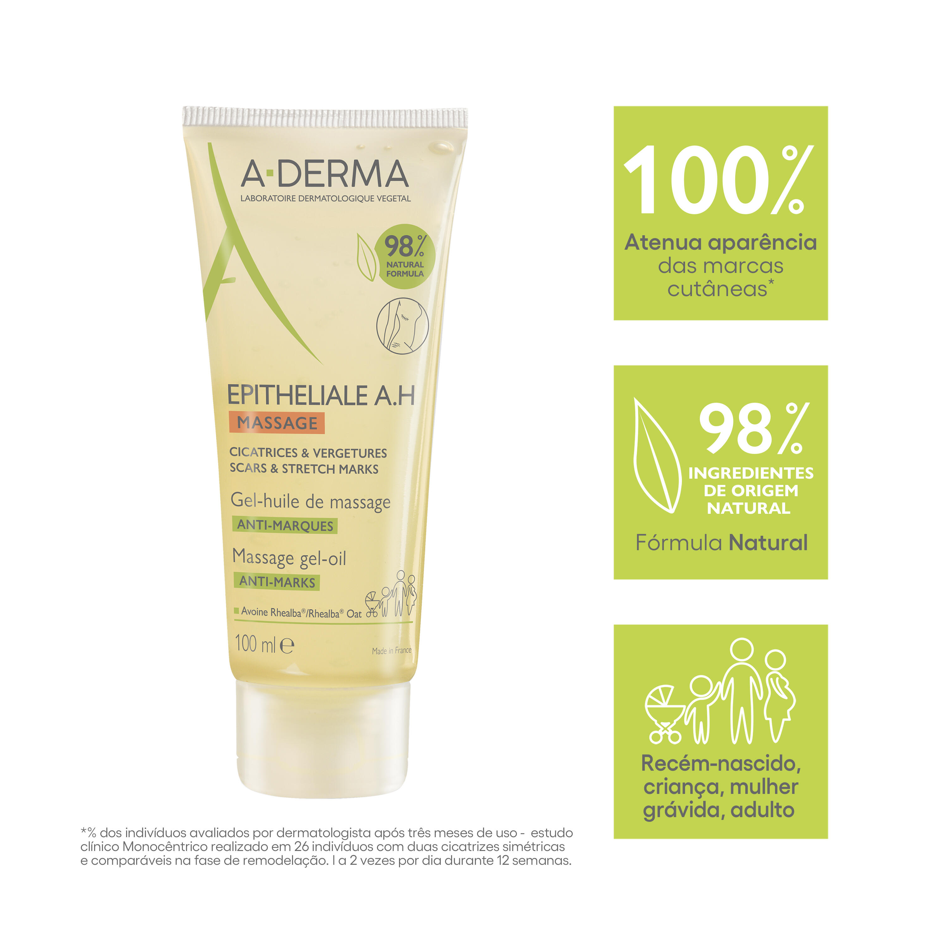 Este gel-óleo para massagem pode ser aplicado duas vezes por dia e ajuda a atenuar a aparência de cicatrizes* e estrias. Uma textura gel-óleo patenteada** que não escorre e se transforma num líquido à medida que se massaja. Um passo recomendado para estimular e encorajar a microcirculação, otimizar a hidratação e reduzir a sensação de repuxar e prurido. A EPITHELIALE A.H.A fórmula do gel-óleo para massagem é isenta de silicone e não contém óleos essenciais. É composto por apenas nove ingredientes que são 98% naturais. Atenua a aparência das marcas cutâneas em 100%¹ dos indivíduos. Recomendado para mulheres grávidas, é também perfeito para toda a família.
