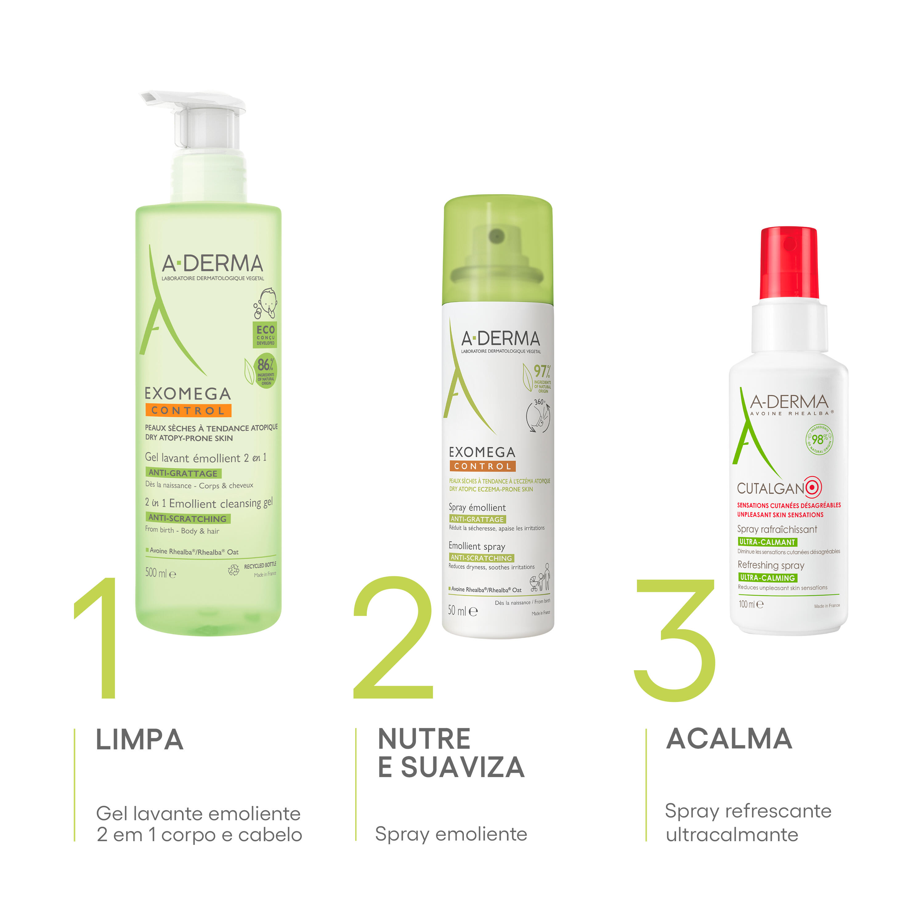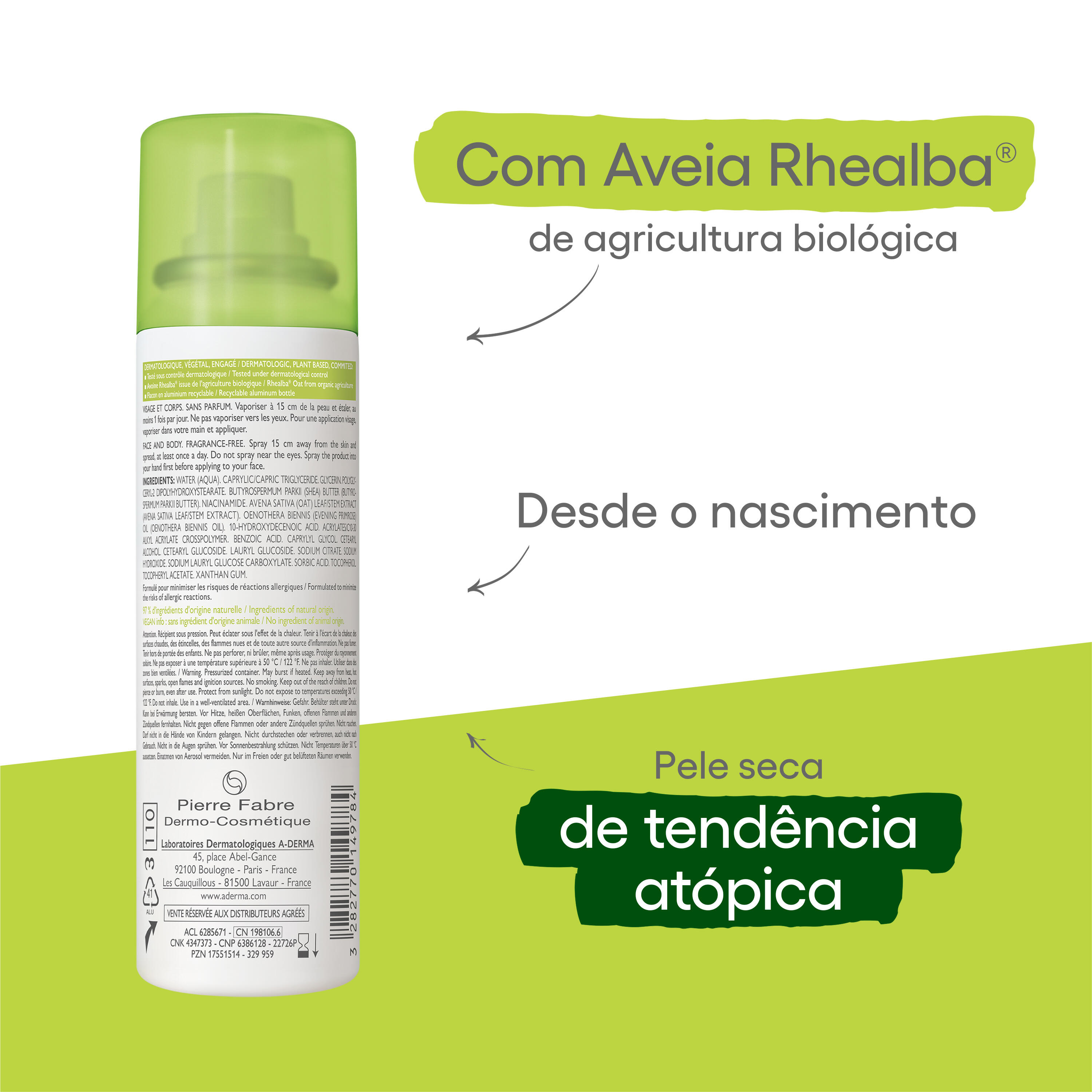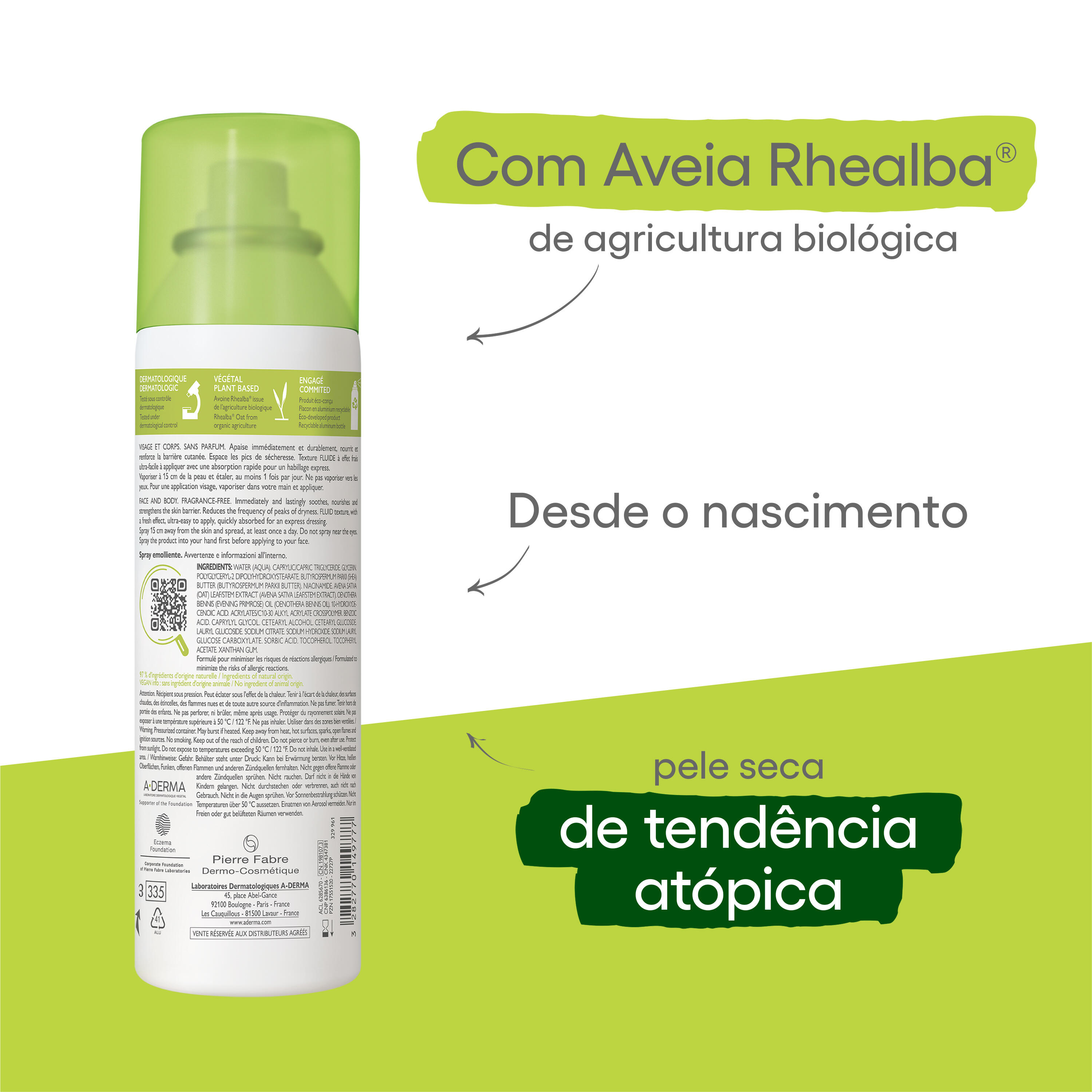 Um gesto prático e ultrarrápido, o Spray emoliente antiprurido ajuda a aliviar a comichão* e a espaçar os picos de irritação na pele seca propensa a eczema atópico, reduzindo ao mesmo tempo a vermelhidão. A sua eficácia a 360° reduz a secura, reforça a barreira cutânea e ajuda a reequilibrar o microbioma. O seu sistema de pulverização 360°, sem gás (graças à tecnologia de "válvula de bolso") e a sua rápida absorção tornam possível, com um gesto diário direcionado, eficaz e apaziguador, acalmar e melhorar a vida diária da pele seca propensa ao eczema atópico. Um spray nutritivo à base de Extrato Vegetal de Aveia Rhealba® (jovens rebentos de aveia), com uma textura fluida. Uma fórmula leve com 97% de ingredientes naturais, sem fragrâncias, adequada desde o nascimento.