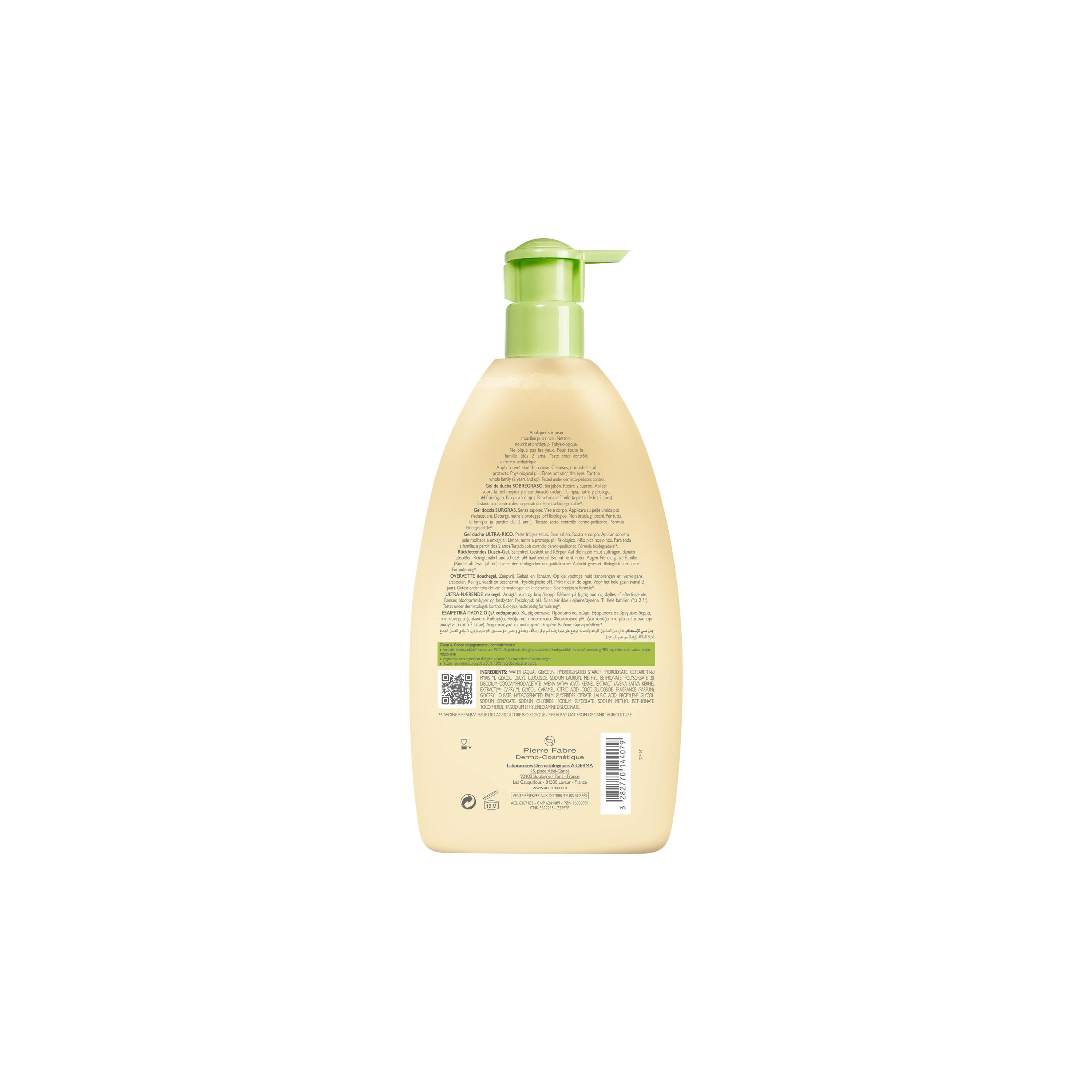 Especialista na higiene da pele frágil, o Laboratório Dermatológico A-DERMA à base de plantas satisfaz as necessidades da pele seca com este gel de duche. Feito com 90% de ingredientes de origem natural** este produto limpa suavemente, nutre e protege. Enriquecido com emolientes naturais, ele reúne tanto a sua eficácia e suas propriedades de reposição de lipídios a partir da Clean Care Complex inovação. Esta combinação apresenta uma base de limpeza suave e um agente compensador para limpar sem remover excessivamente ou secar a pele. A sua fórmula cremosa com o calmante Extrato de Aveia Rhealba® suaviza a pele. BIODEGRADÁVEL* e sem sabão, o GEL DE DUCHE ULTRA-RICO é adequado para toda a família e pode ser aplicado tanto no rosto como no corpo. No duche, transforma-se numa espuma subtilmente perfumada e leve, que se enxagua facilmente. A pele seca é nutrida*** acalmada*** e protegida. Aveia Rhealba® derivada da agricultura biológica. Embalagem contendo 50% de plástico reciclado. Informação vegan : sem ingredientes de origem natural. * De acordo com a norma OCDE 301B. ** Contém 90% de ingredientes de origem natural. *** 97% dos indivíduos encontraram a pele nutrida - Resultado obtido após o estudo da eficácia e tolerância em crianças - 33 indivíduos. **** 100% dos indivíduos encontraram a pele apaziguada - Resultado obtido após o estudo da eficácia e tolerância em crianças - 33 indivíduos.