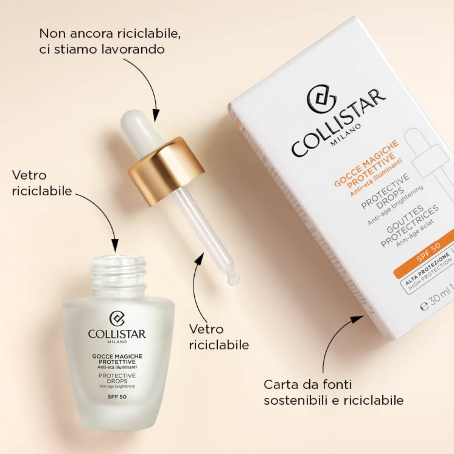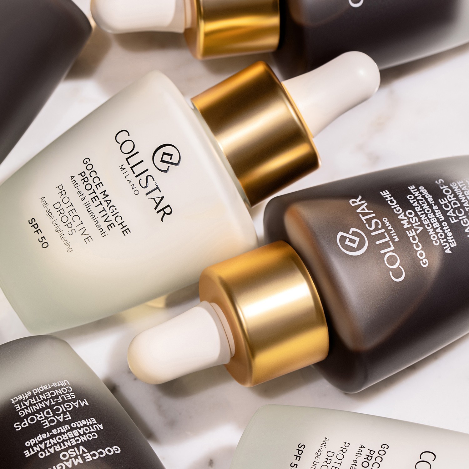 Gocce Magiche Protettive SPF50, o primeiro gesto anti-idade: proteção diária com SPF50. Pele protegida, iluminada e tez uniforme.
