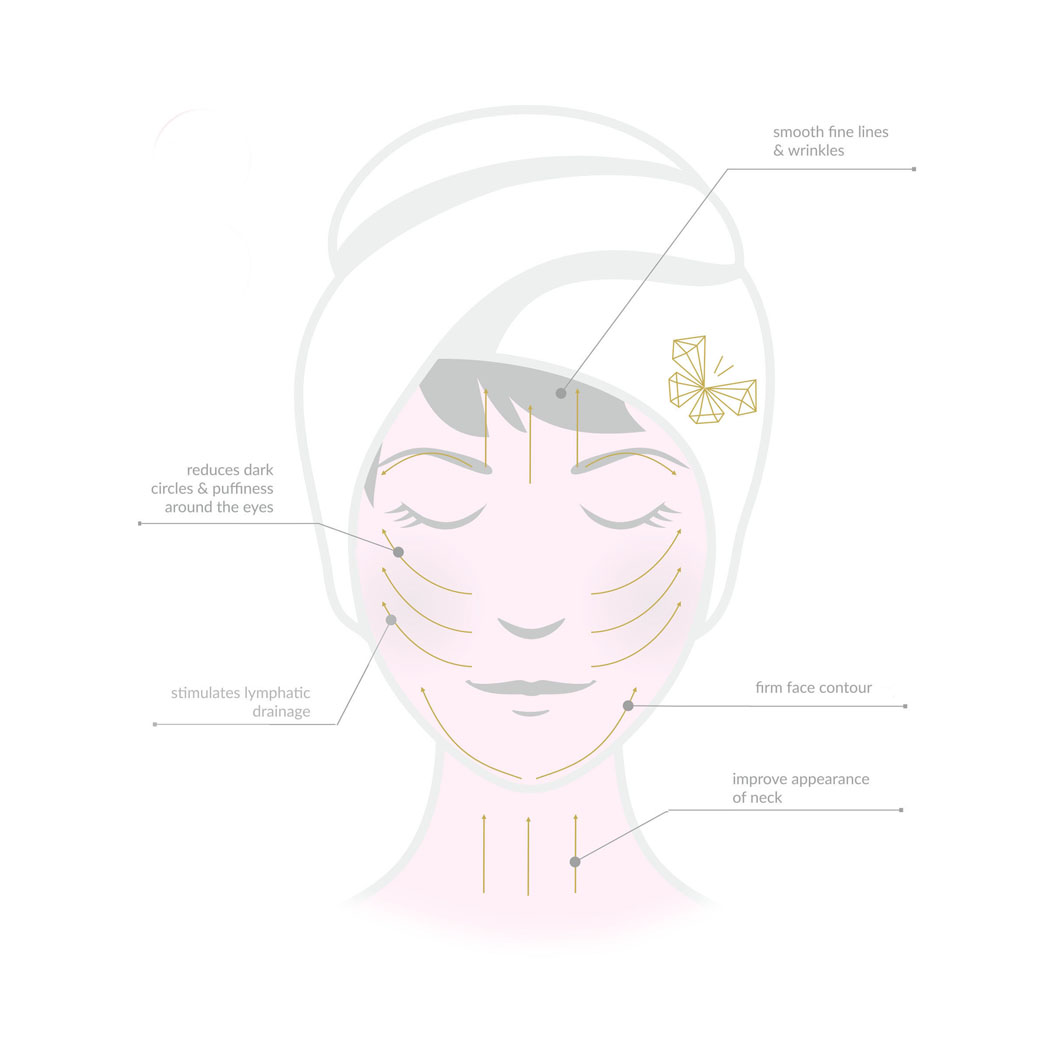 Massaje o rosto, sobre a pele limpa e coberta com o seu óleo ou serum preferido, para que a pedra deslize facilmente sobre a pele. Fazer movimentos de dentro para fora do rosto