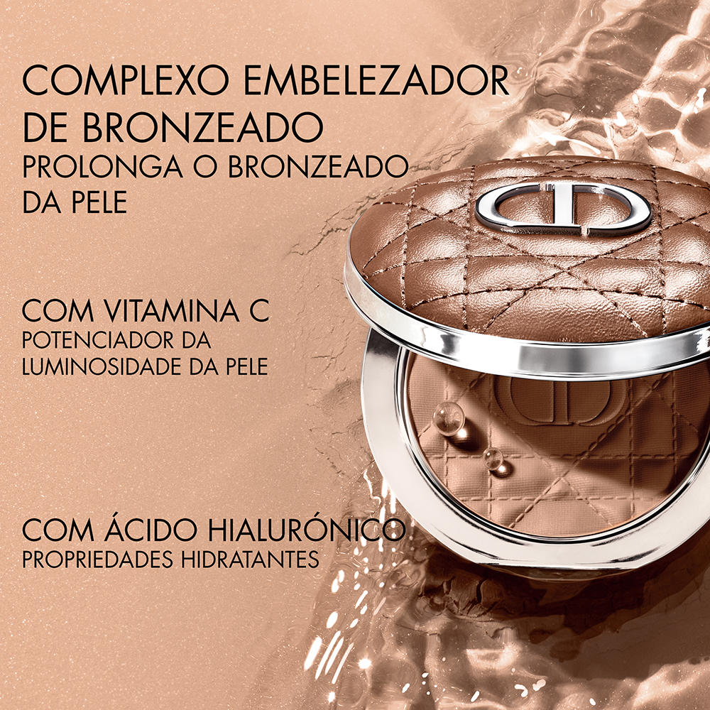 O verão na sua pele, num só gesto: Dior Forever Nude Bronze realça a tez com um efeito bronzeado naturalmente luminoso ou mate, sem demarcação. Composto por 95% de ingredientes de origem natural¹, este pó bronzeador "summer proof"² é o aliado de longa duração e sem transferência3 dos dias de sol. Dior Forever Nude Bronze integra o complexo "Tan Beautifyer", infundido com ácido hialurónico e derivado de vitamina C, para um bronzeado de verão duradouro.