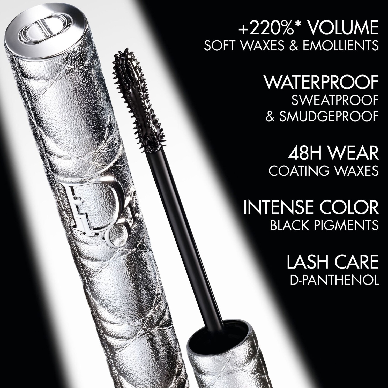 A escova oferece uma combinação de cerdas inovadora. O centro da escova concentra o produto e aplica a dose certa desde a primeira passagem, sem acumular. A embalagem desta máscara de pestanas Dior apresenta o padrão cannage, um código couture emblemático da Maison, reinterpretado numa cor prateada metalizada.