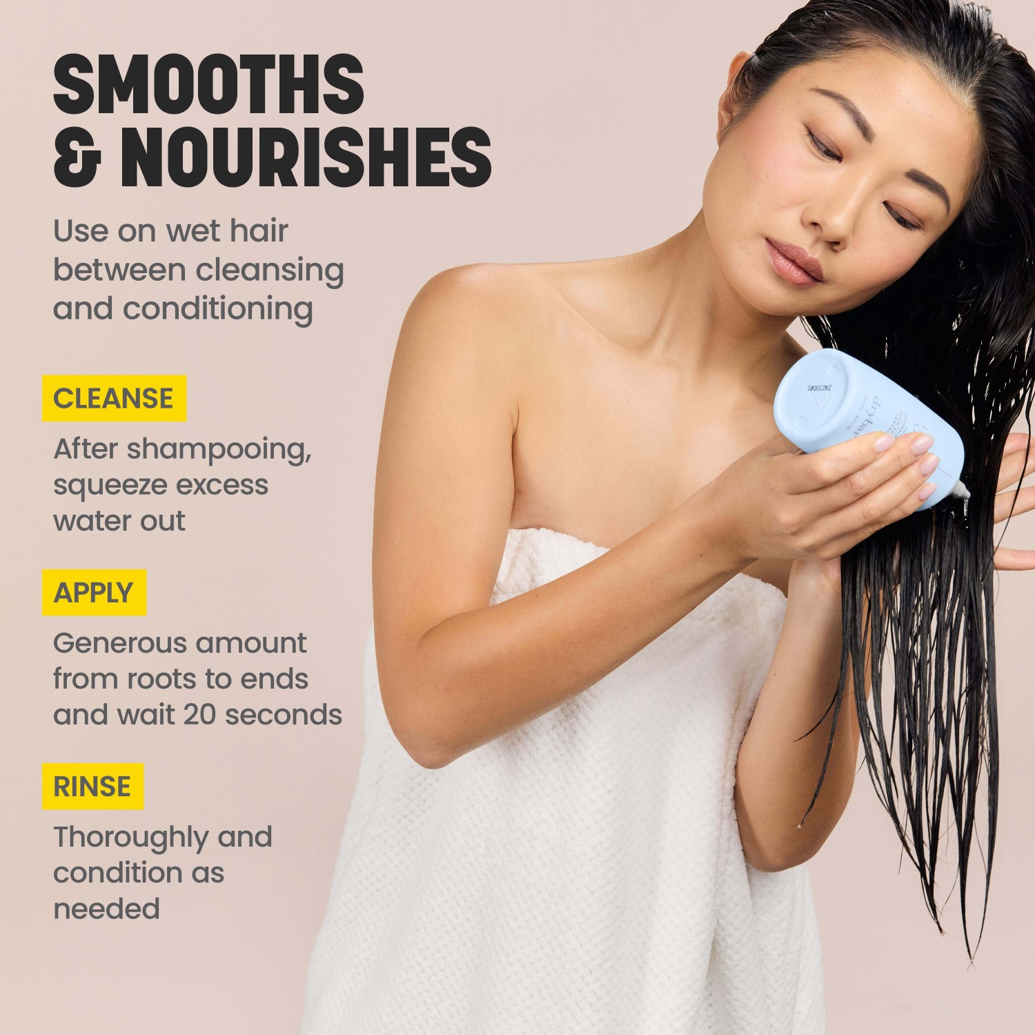 Para usar em cabelos molhados. Após lavar com shampoo, retire o excesso de água dos cabelos. Aplique uma quantidade generosa diretamente nos cabelos, da raiz às pontas. Deixe agir por 10 segundos e enxágue bem. Em seguida, aplique um condicionador, se preferir. Finalize como de costume.