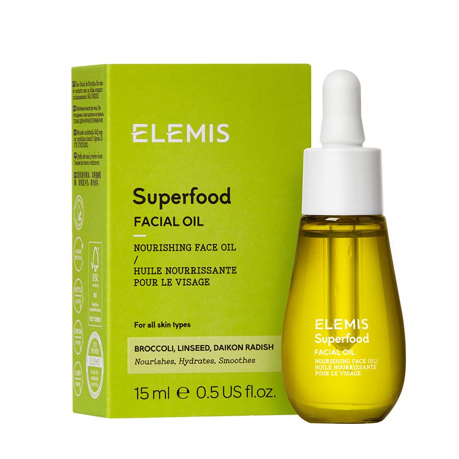Elemis Superfood Facial Oil 15ml é uma fórmula premiada que promete recarregar sua pele com as porções diárias de verduras recomendadas. Na verdade, adequada para todos os tipos de pele, esta composição altamente concentrada recorre a nove Óleos Superalimentos diferentes! Ingredientes como Brócolis, Rosa Mosqueta, Linhaça e Rabanete Daikon fornecem à composição antioxidantes e ácidos graxos essenciais, alimentando sua pele com todos os nutrientes necessários. Como resultado, após cada aplicação, o Superfood Facial Oil revela uma tez mais volumosa e suave, que se sente e parece mais saudável. Ainda mais, o óleo também se mostra eficaz no combate ao embotamento, aumentando assim o brilho natural da pele. Além de seus inúmeros benefícios, o Superfood Facial Oil também proporciona uma experiência de usuário sem esforço e agradável. A sua consistência leve e não gordurosa funde-se rapidamente com a pele garantindo um processo de fácil absorção. Além disso, esta fórmula possui um aroma único com notas de laranja doce, palmarosa e lavanda para uma aplicação multissensorial luxuosa.