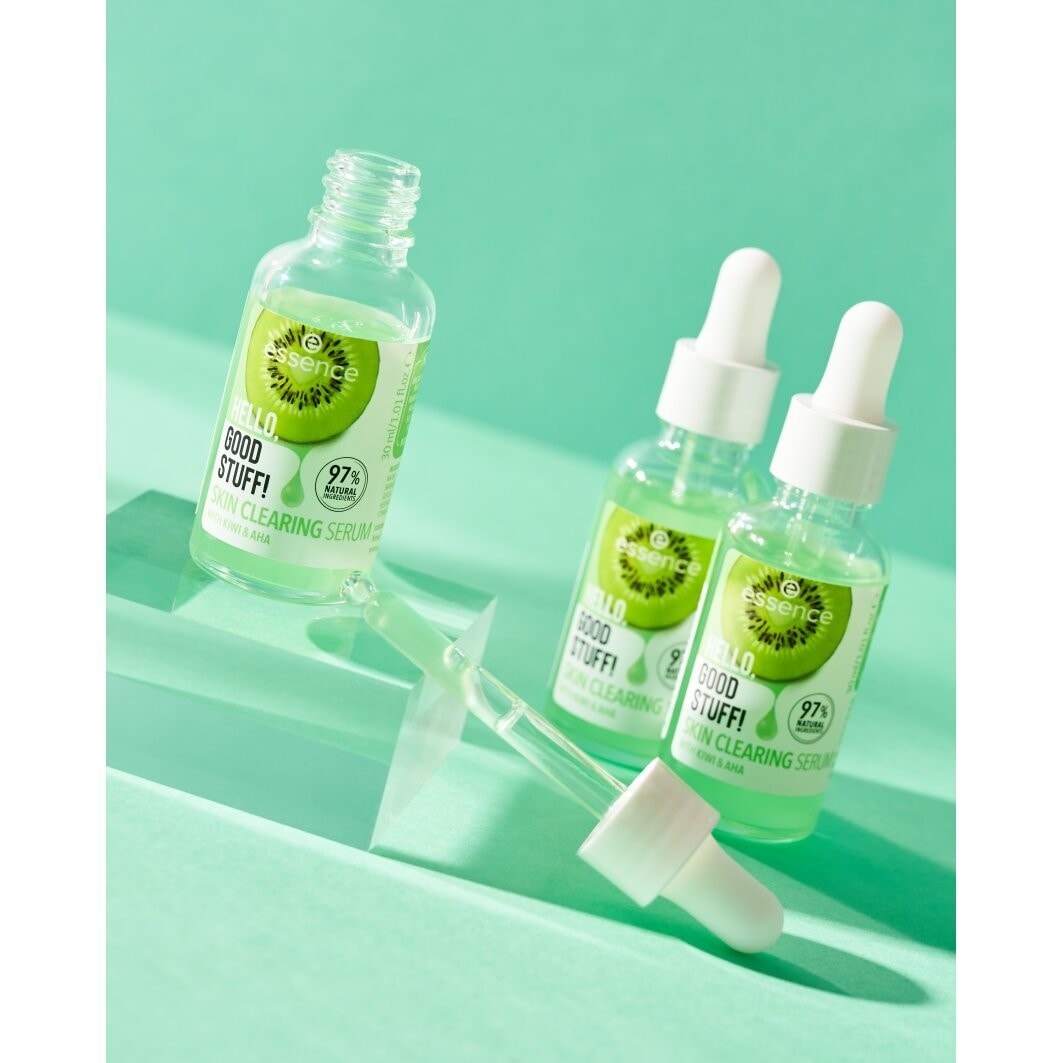O Hello, Good Stuff! Sérum Skin Clearing contém AHA para um efeito esfoliante suave, bem como água de kiwi e pantenol nutritivo. A fórmula é composta por 97% de ingredientes naturais e faz com que a pele fique ultra suave.