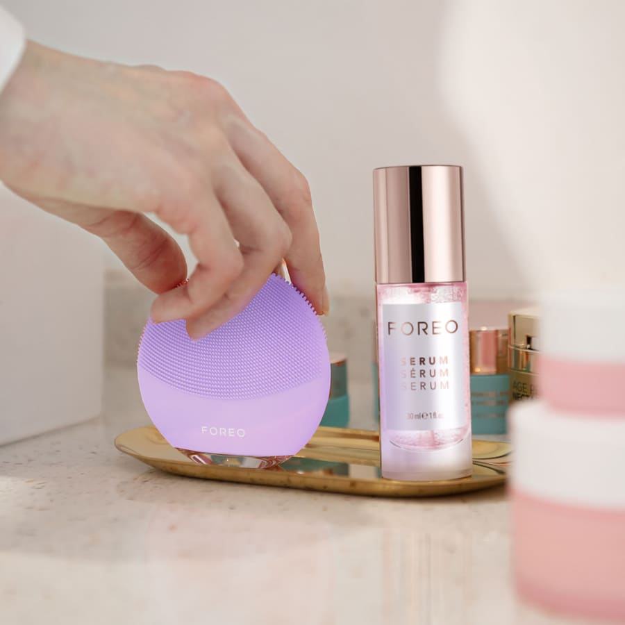 UTILIZAÇÃO SUGERIDA • Descarrega a aplicação FOREO, emparelha o LUNA™ 4 mini por Bluetooth para o registares e desbloqueares • Aplica o gel de limpeza. Para os melhores resultados, utiliza com o Micro-Foam Cleanser • Pressiona o botão universal uma vez para o modo de limpeza ou pressiona rapidamente duas vezes para o modo Glow Boost • Utiliza movimentos circulares nas bochechas e na testa, para cima e para baixo do nariz • Enxagua e seca o rosto