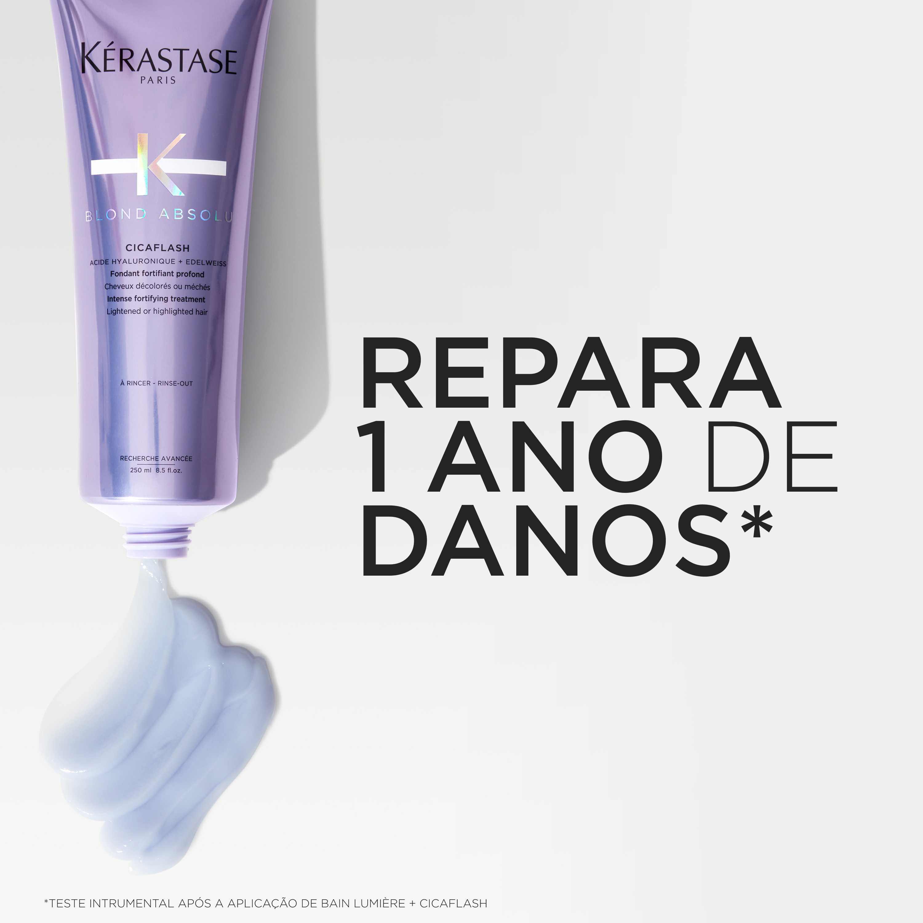 O Cicaflash é um condicionador em gel leitoso opalescente com uma tonalidade suave de lavanda oferece o desempenho reparador de uma máscara com o acabamento leve de um condicionador. Repara intensivamente o cabelo sensibilizado, nutrindo a fibra. A combinação de Ácido Hialurónico com flor de Edelweiss suaviza e fortalece instantaneamente o cabelo aclarado sensibilizado enquanto o nutre em profundidade. Ideal para todos os cabelos aclarados ou com descoloração, Cicaflash repara a fibra capilar, prevenindo a quebra e a erosão. O cabelo fica suave e hidratado sem perder a sua leveza e luminosidade.