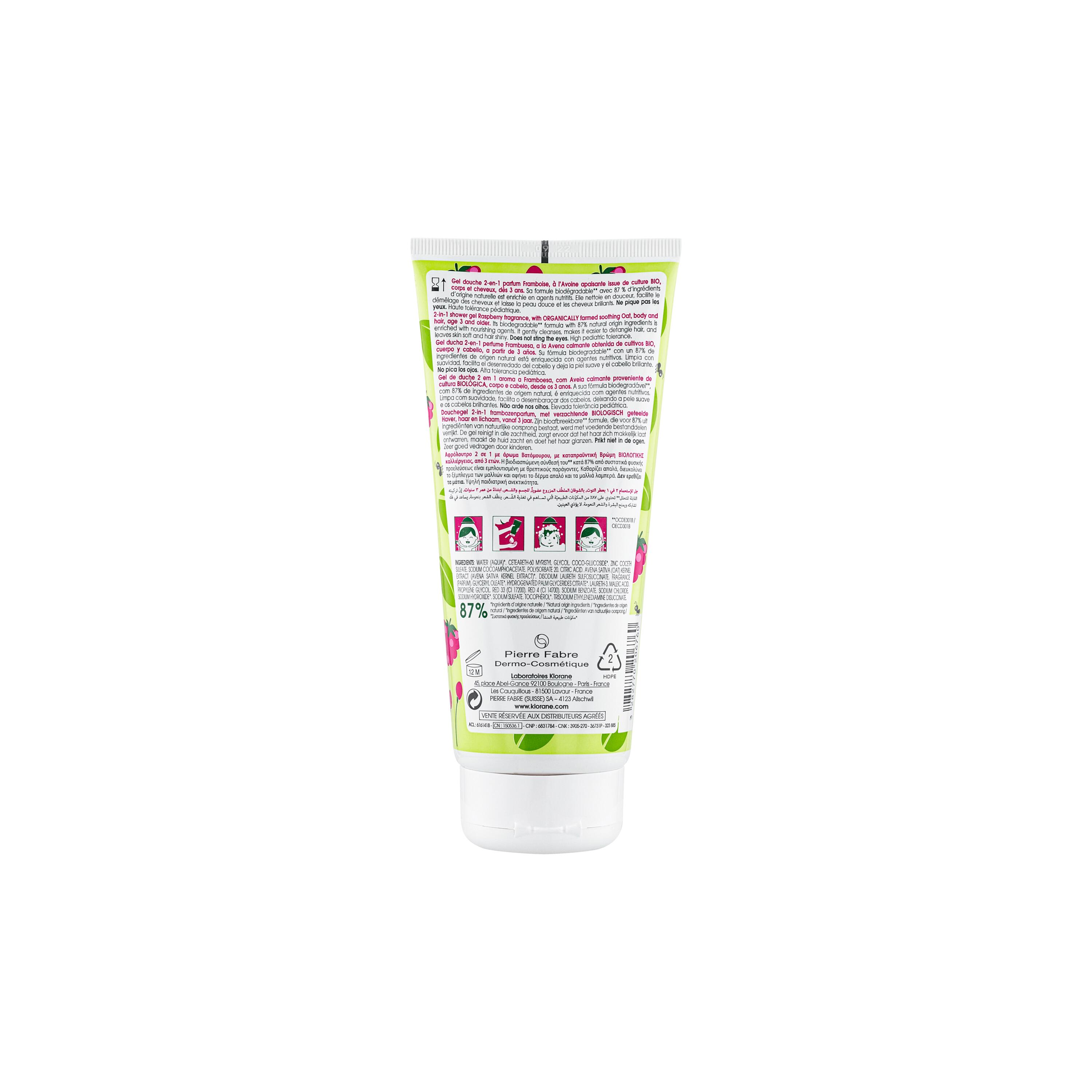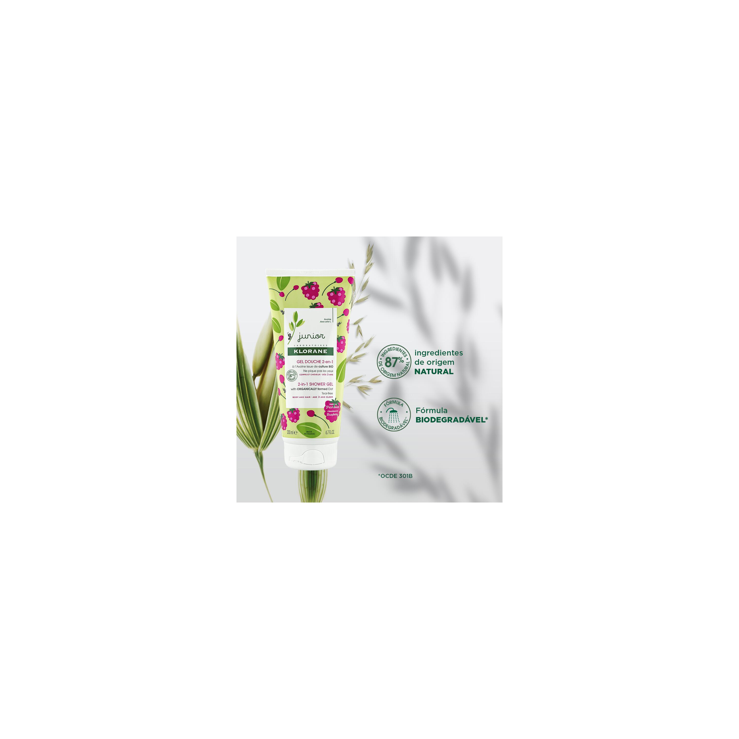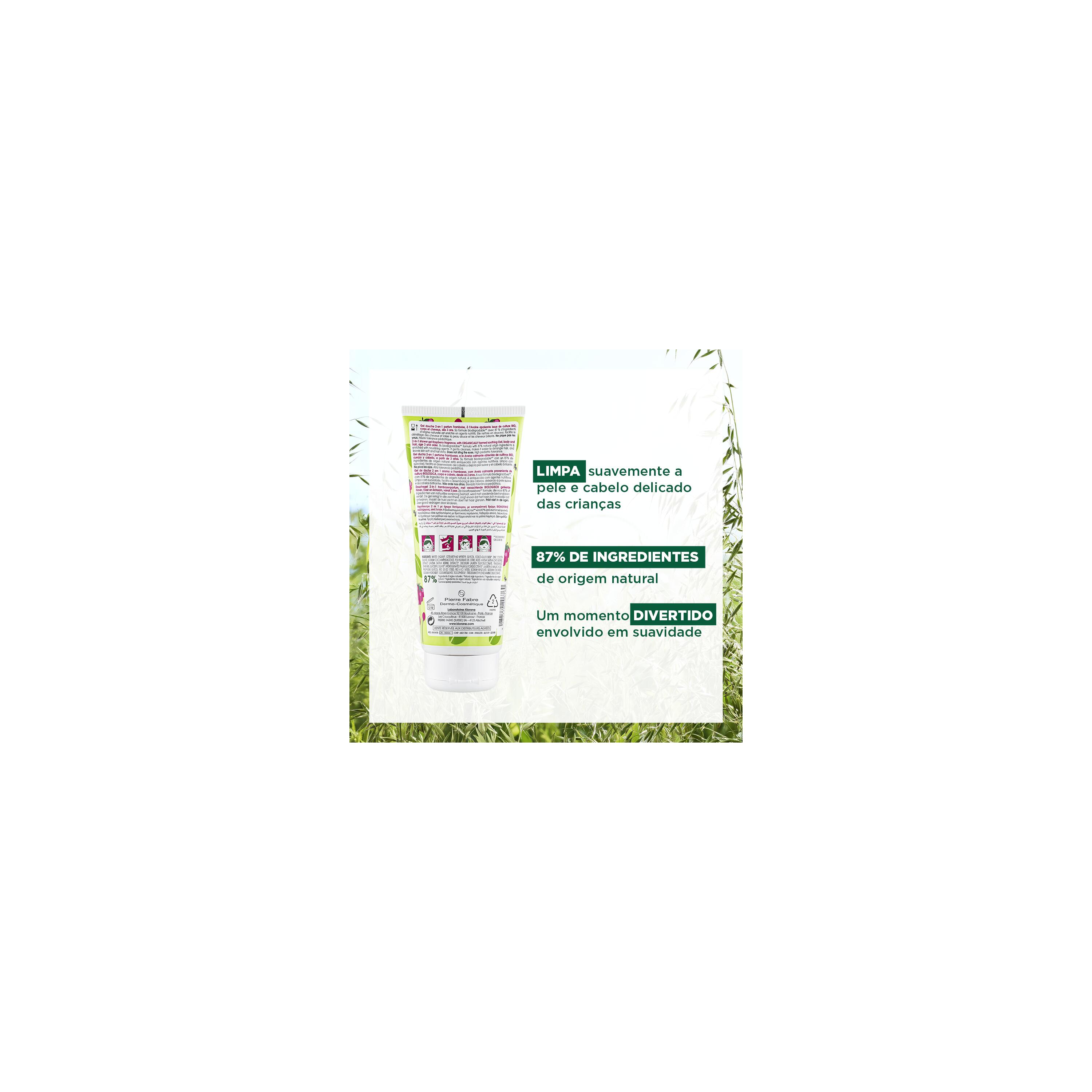 A Klorane formulou o Gel de Duche 2 em 1 com Aveia BIO aroma a Framboesa para limpar suavemente a pele e o cabelo delicado das crianças a partir dos 3 anos, sem arder nos olhos. A fórmula biodegradável* com elevada tolerância em bebés é composta por 87% de ingredientes de origem natural, incluindo aveia de cultivo biológico. Este ingrediente ativo é conhecido pelas suas propriedades calmantes e é combinado com agentes ricos em nutrientes para suavizar a pele e o cabelo sem alterar o seu delicado equilíbrio. A textura fundente do Gel de Duche 2 em 1 forma uma espuma leve com um delicioso perfume a framboesa. A pele fica apaziguada e nutrida** e o cabelo fica brilhante e flexível. Colorida e divertida, a embalagem prática pode ser levada para todo o lado, para um tempo divertido na hora do banho.
