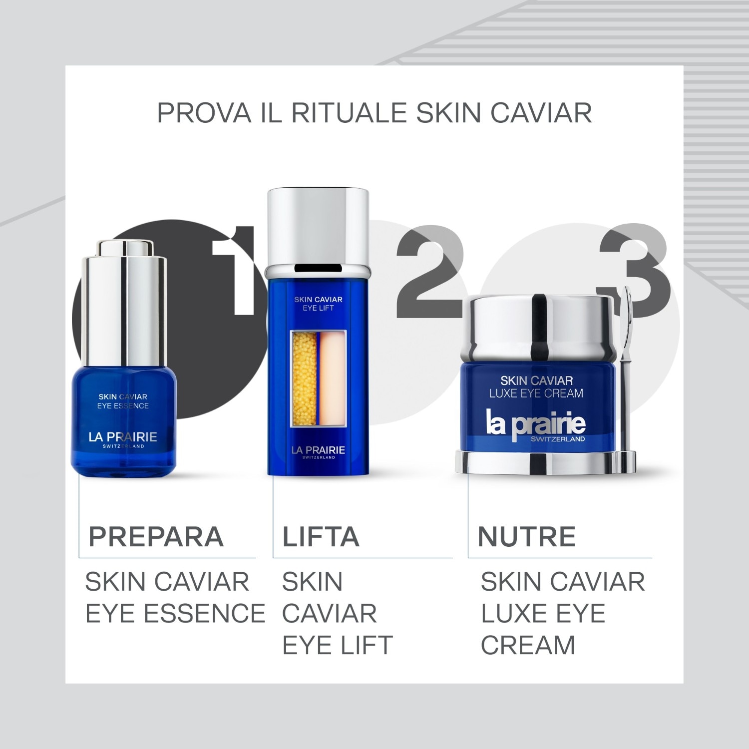 Water (Aqua), Propylene Glycol, Lactose, PEG-40 Hydrogenated Castor Oil, Panthenol, Glycerin, Algae Extract, Glycoproteins*, Panax Ginseng Root Extract*, Equisetum Arvense Extract*, Saccharomyces Cerevisiae Extract*, Lactobacillus Ferment*, Caviar Extract, Fructose, Polyquaternium-11, Allantoin, Sodium Hydroxide, Carbomer, Pyrus Malus (Apple) Fruit Extract, Pantolactone, Sodium Lactate, Caprylyl Glycol, Saccharide Isomerate, Glyceryl Polymethacrylate, Xanthan Gum, Yeast Extract, Citric Acid, Sodium Citrate, Aleuritic Acid, Ethylhexylglycerin, Phenoxyethanol, Methylparaben, Ethylparaben, Sodium Dehydroacetate i18023A03 * La Prairie’s Exclusive Cellular Complex / Patent EP 3062763Please consider that all La Prairie products are labeled with an ingredient list. Please note that the ingredient list printed on the product in your possession shall prevail.
