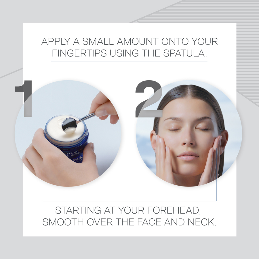 Aplique de manhã e à noite após a limpeza de pele e a aplicação do tónico, do tratamento pré-sérum e sérum. Use a elegante espátula para aplicar uma pequena quantidade de creme hidratante na ponta dos dedos. Espalhe suavemente sobre o rosto, pescoço e decote com um movimento para fora e para cima, evitando a zona dos olhos. Deixe absorver completamente. De manhã, prossiga com a aplicação de protetor solar.