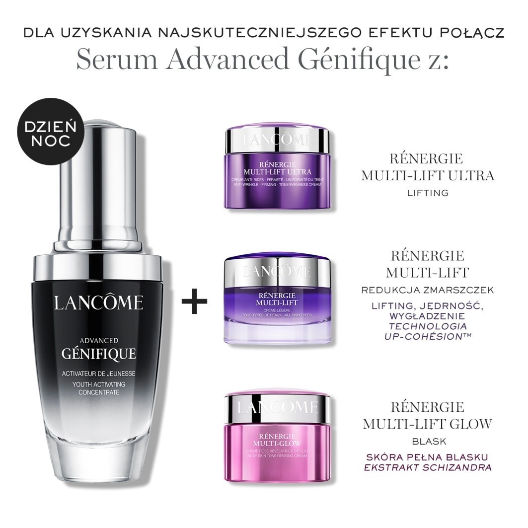 Rénergie Multi Glow Creme de dia,é um tratamento anti-idade de Lancôme que reativa a luminosidade rosada natural de uma pele madura. Associa Extratos de Bagas vermelhas, Shizandra e Extrato de Linhaça Pro lifting num só tratamento, para uma ação anti-rugas, firmeza, nutrição e luminosidade. Com um perfeito equilíbrio de uma textura que alia a frescura à nutrição intensa. Pele repulpada, contornos redefinidos, luminosidade imediata.