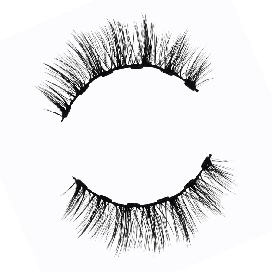 3) Aplique as pestanas começando pelos cantos internos, pressionando levemente ao longo da linha das pestanas prendendo o íman no lugar. Ajuste conforme necessário. Aperte e pressione perto das raízes dos cílios para fixá-los.