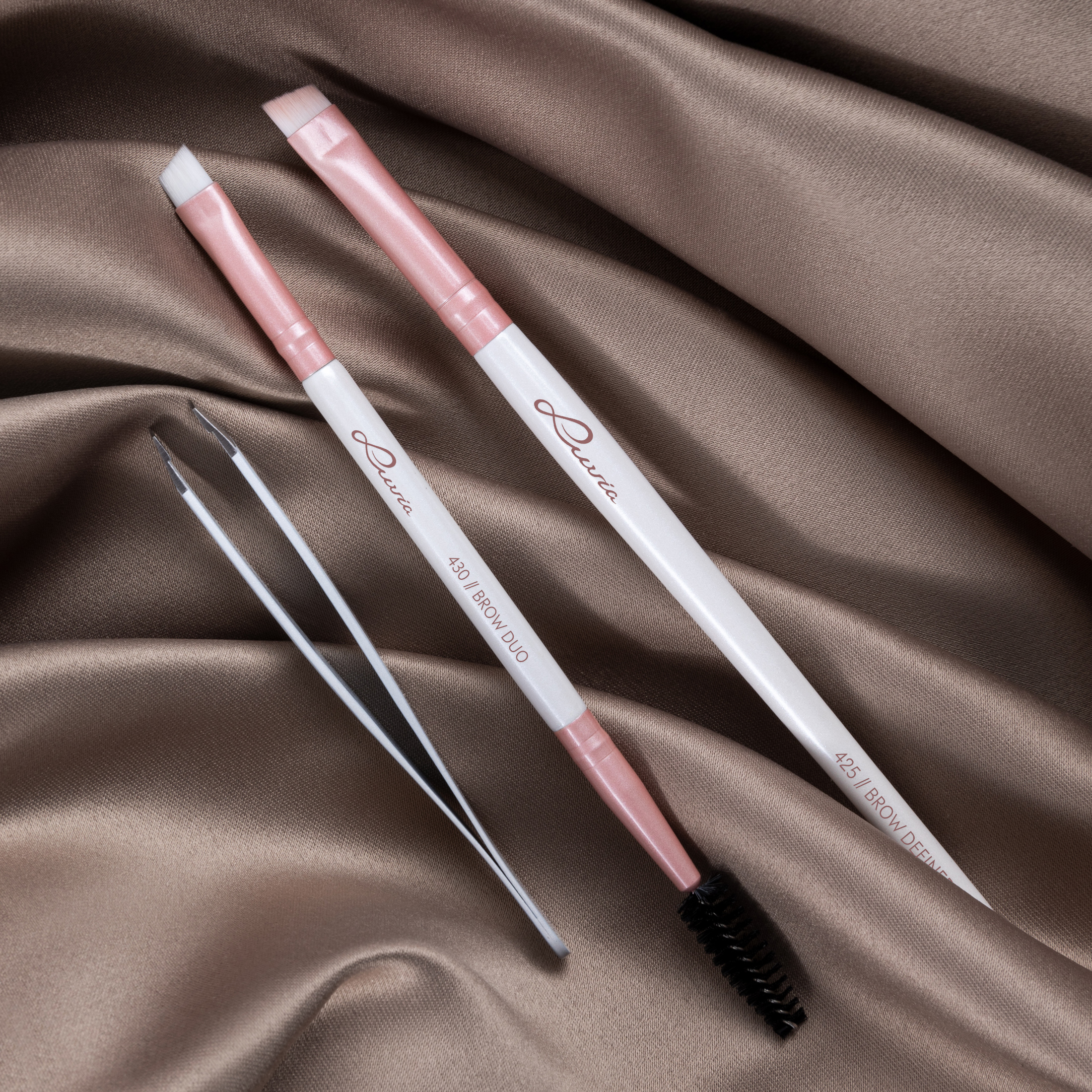 As pincéis de sobrancelhas são perfeitas para preencher pequenas lacunas. O pincel no Brow Duo traz as sobrancelhas para a forma desejada num instante. As pinças práticas podem ser usadas para remover com precisão os cabelos individuais.