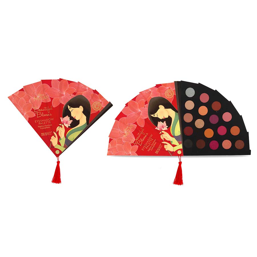 Paleta em forma de leque com 18 sombras com a ilustração de Mulán. Com tons neutros e quentes, glosses, foscos e shimmer. Ideal para maquiagem de dia ou festa.