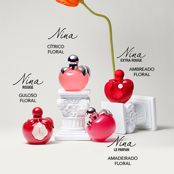 A SORTE FAVORECE OS AUDAZES Siga os seus instintos e sinta a intensidade deste perfume vertiginoso. Uma fragrância provida de uma dimensão embriagante, este novo aroma floral, amadeirado e frutado convida a ir atrás dos seus sonhos. Contrastando extratos de maçã e as suas notas frutadas, flores brancas elegantes e madeira ambreada sensual, Nina Le Parfum é sedutor e envolvente.