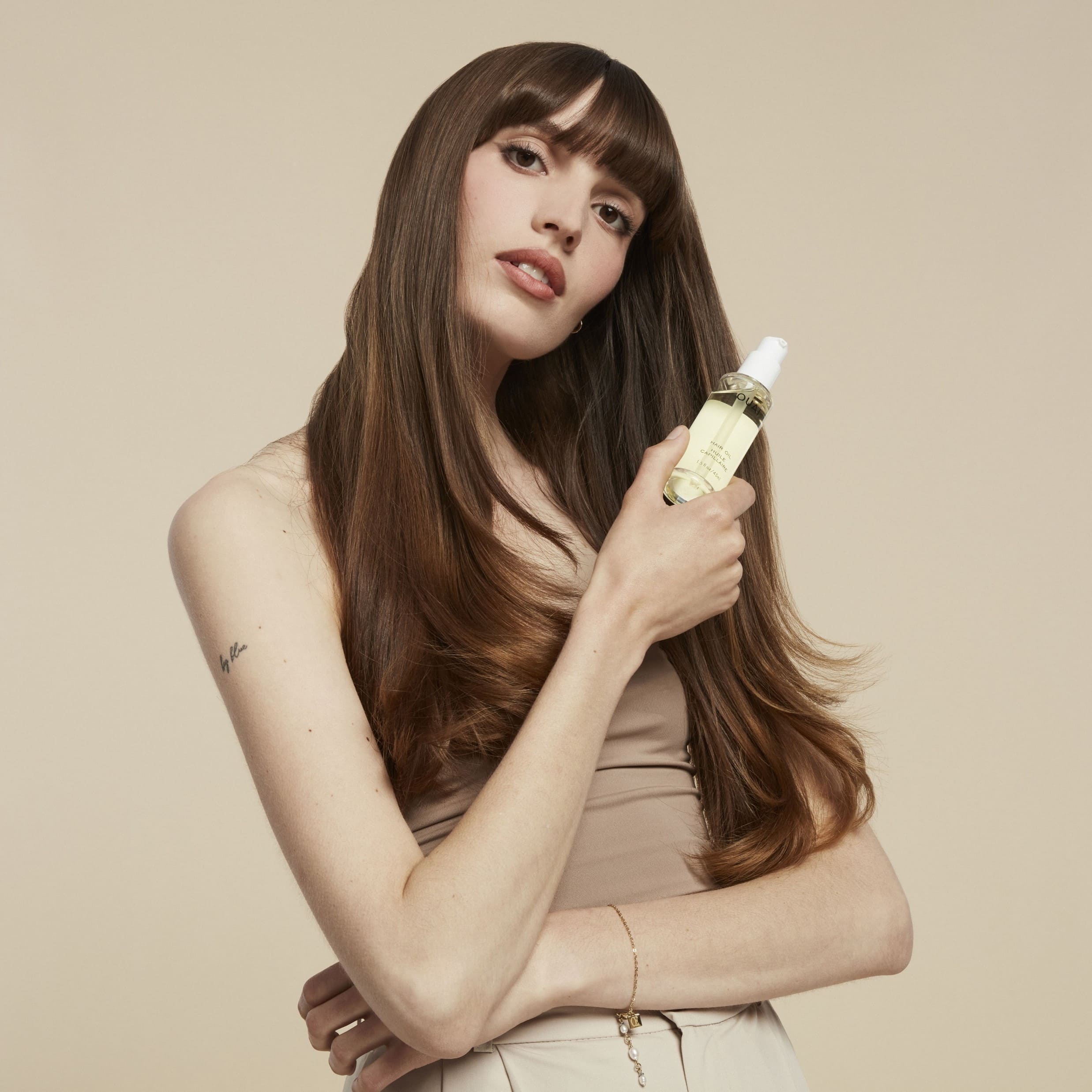 Um óleo multifacetado que amacia o aspeto frisado e veda as pontas espigadas para um acabamento super brilhante e super suave. Repleto de óleos de galanga africana, amaranto e borragem asiática impede que a cor se desvaneça e protege o cabelo de danos provocados pelo calor. O resultado final é um cabelo sem aspeto frisado e liso. Seguro para a cor. Protege a cor.