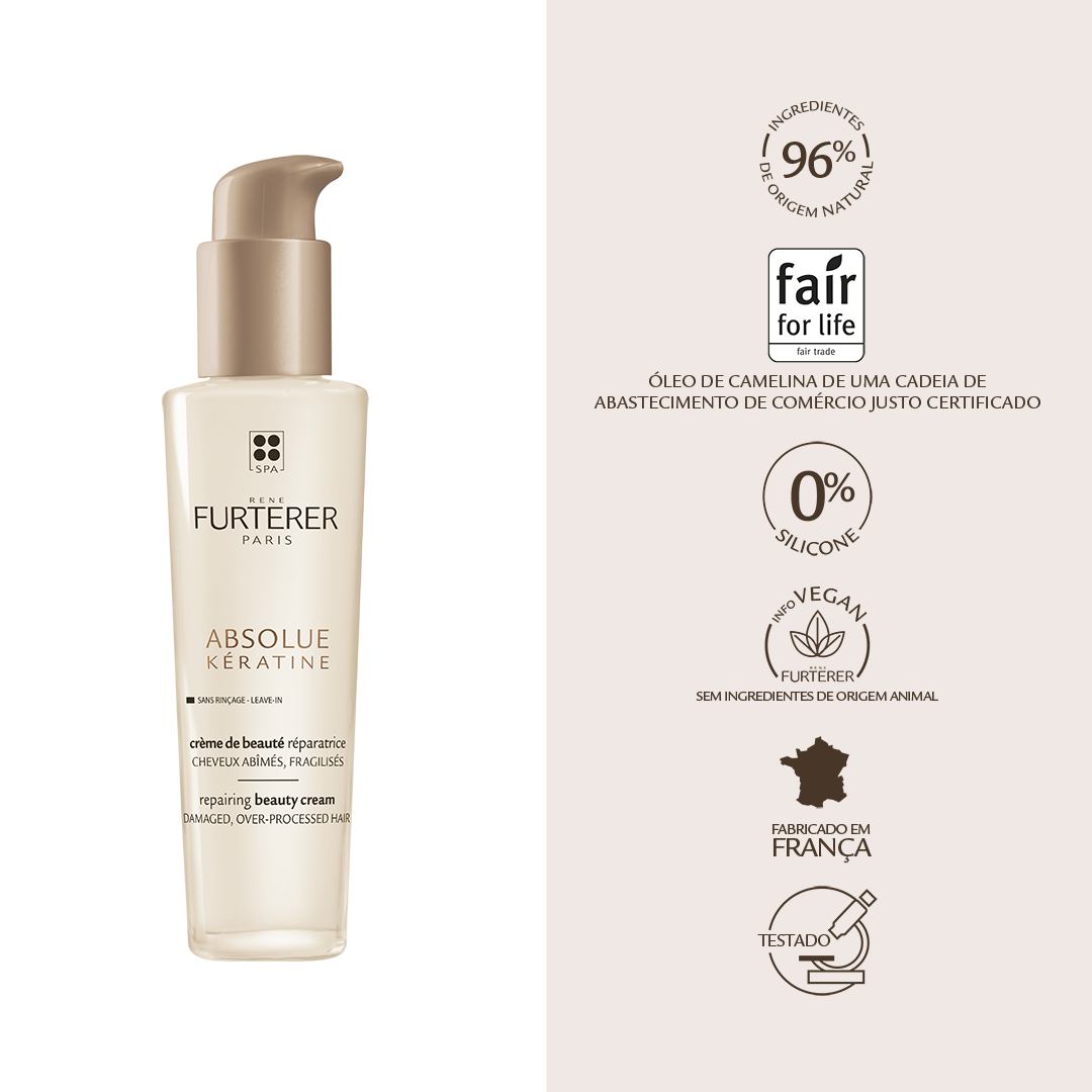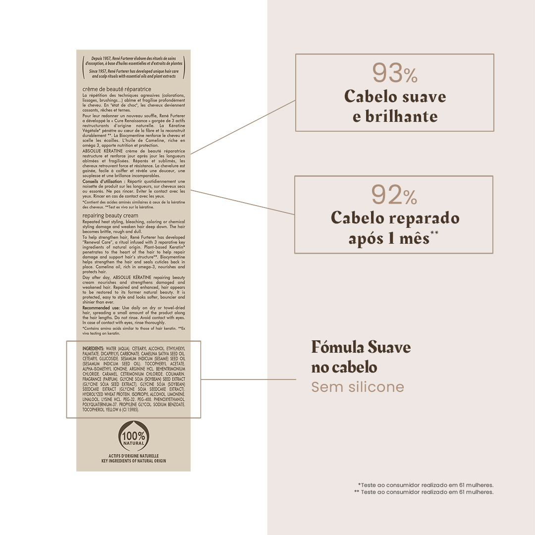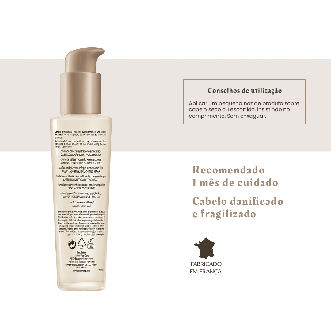 A repetição de várias técnicas agressivas (colorações, alisamentos, brushings...) danifica e fragiliza profundamente o cabelo. Em "estado de choque", os cabelos tornam-se quebradiços, ásperos e baços. Para dar ao cabelo uma nova vida, foi desenvolvido o "Cuidado de Renascimento", composto por 3 ingredientes ativos reestruturantes de origem natural. A Queratina vegetal penetra no coração da fibra capilar e reconstrói-a duradouramente. A Biocimentina reforça o cabelo em profundidade e fecha as escamas. O óleo de Camelina, rico em ómega 3, oferece nutrição e proteção. O Creme de Beleza Reparador reestrutura e reforça dia após dia o comprimento dos cabelos danificados e fragilizados. Reparados e sublimados, os cabelos recuperam a força e resistência. O cabelo fica embainhado, fácil de pentear e revela uma suavidade, uma leveza e um brilho incomparáveis.