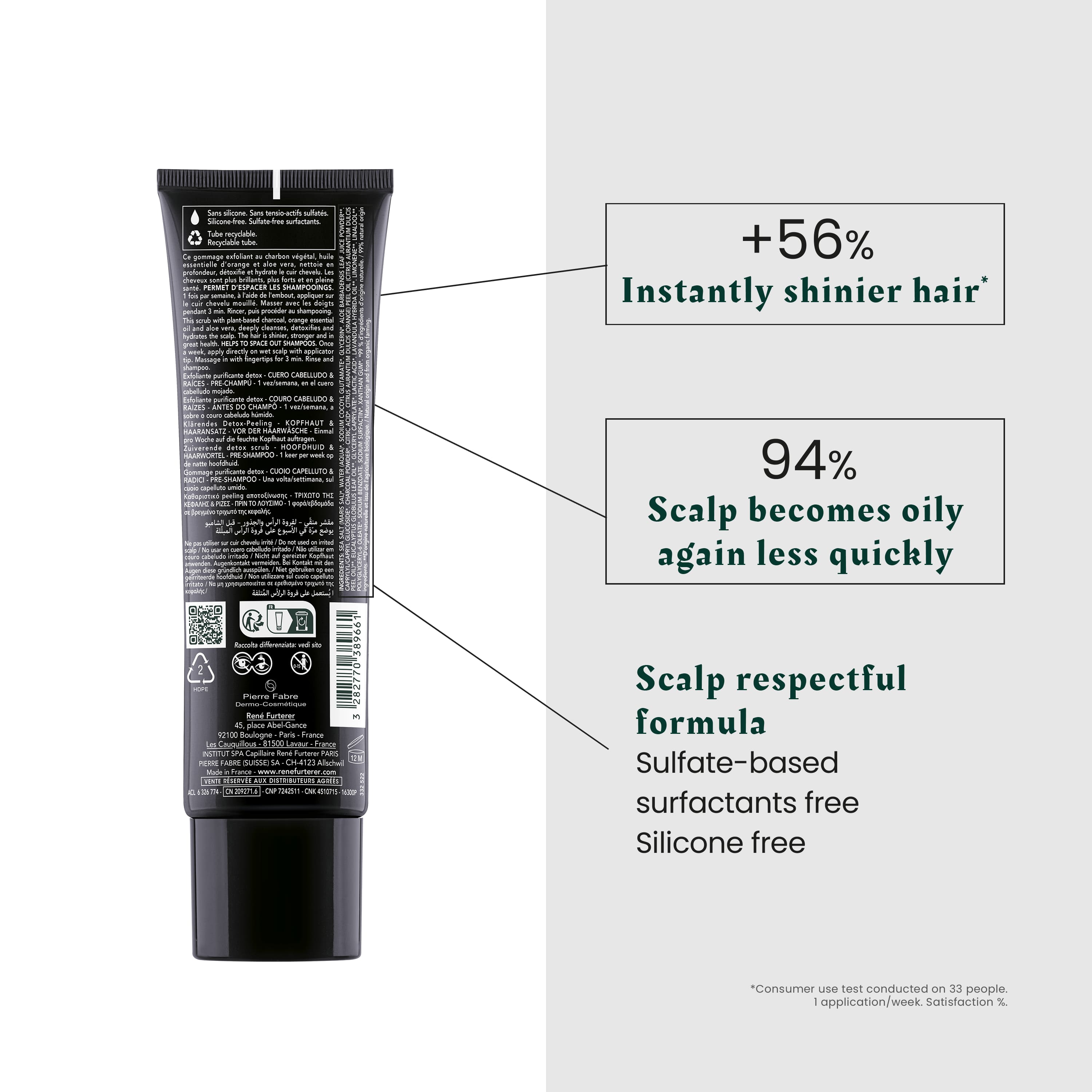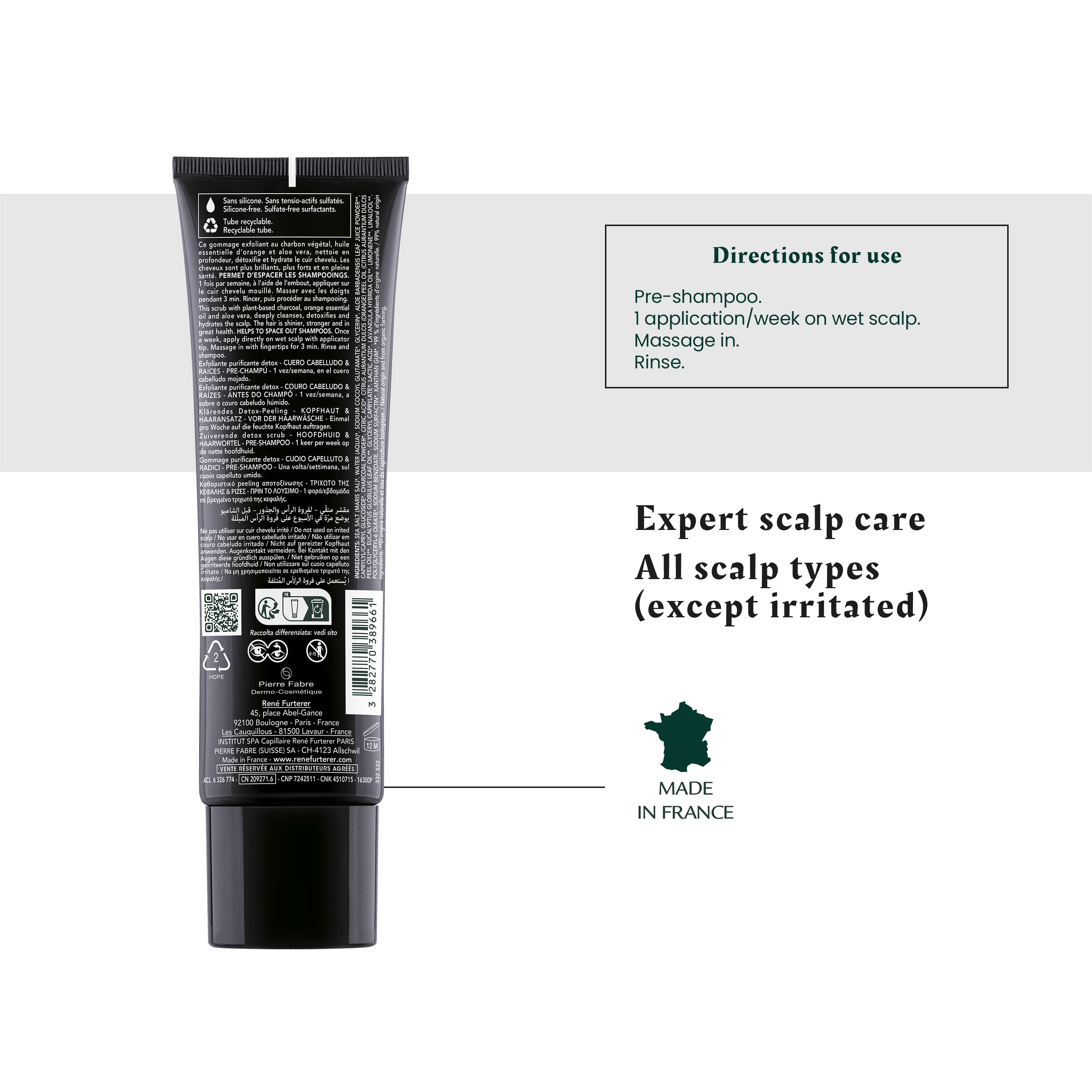 Este cuidado pré-champô 99% natural limpa e desintoxica profundamente o couro cabeludo, eliminando o excesso de sebo em 3 minutos. Graças à ação combinada do sal marinho de Guérande, carvão vegetal, aloé vera e óleo essencial de laranja bio, limpa 100% de impurezas e elimina a caspa existente ao mesmo tempo que proporciona hidratação ao couro cabeludo. A sua textura esfoliante suave funde-se no cabelo, envolvendo-o numa fragrância natural, criando uma espuma leve que se enxagua facilmente. Os poros ficam limpos na perfeição, o couro cabeludo é capaz de respirar a longo prazo e o cabelo é lavado menos frequentemente: O cabelo recupera a sua luminosidade e fica mais forte e saudável. Sem tensioativos sulfatados*. Sem silicone.