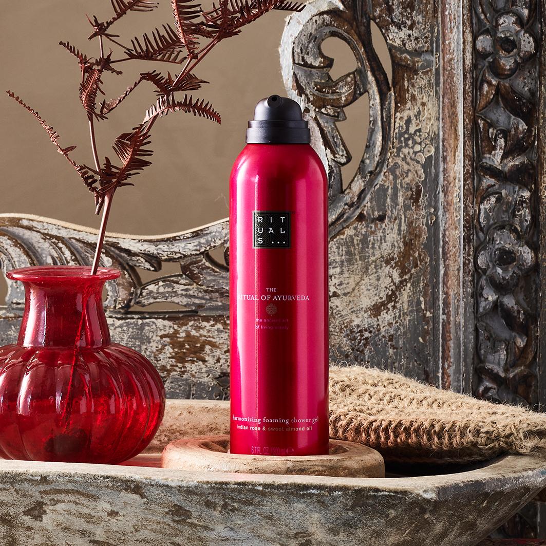 Alcance o equilíbrio entre mente, corpo e alma com esta espuma de duche The Ritual of Ayurveda. Só tem de aplicar uma pequena quantidade na mão e ver como o gel se transforma numa espuma rica e luxuosa. Enriquecida com ingredientes ayurvédicos ancestrais como a rosa indiana e o óleo de amêndoa doce, deixa a pele suave e nutrida. Desfrute de uma experiência verdadeiramente harmonizadora combinando a espuma de duche com outros produtos da mesma coleção.