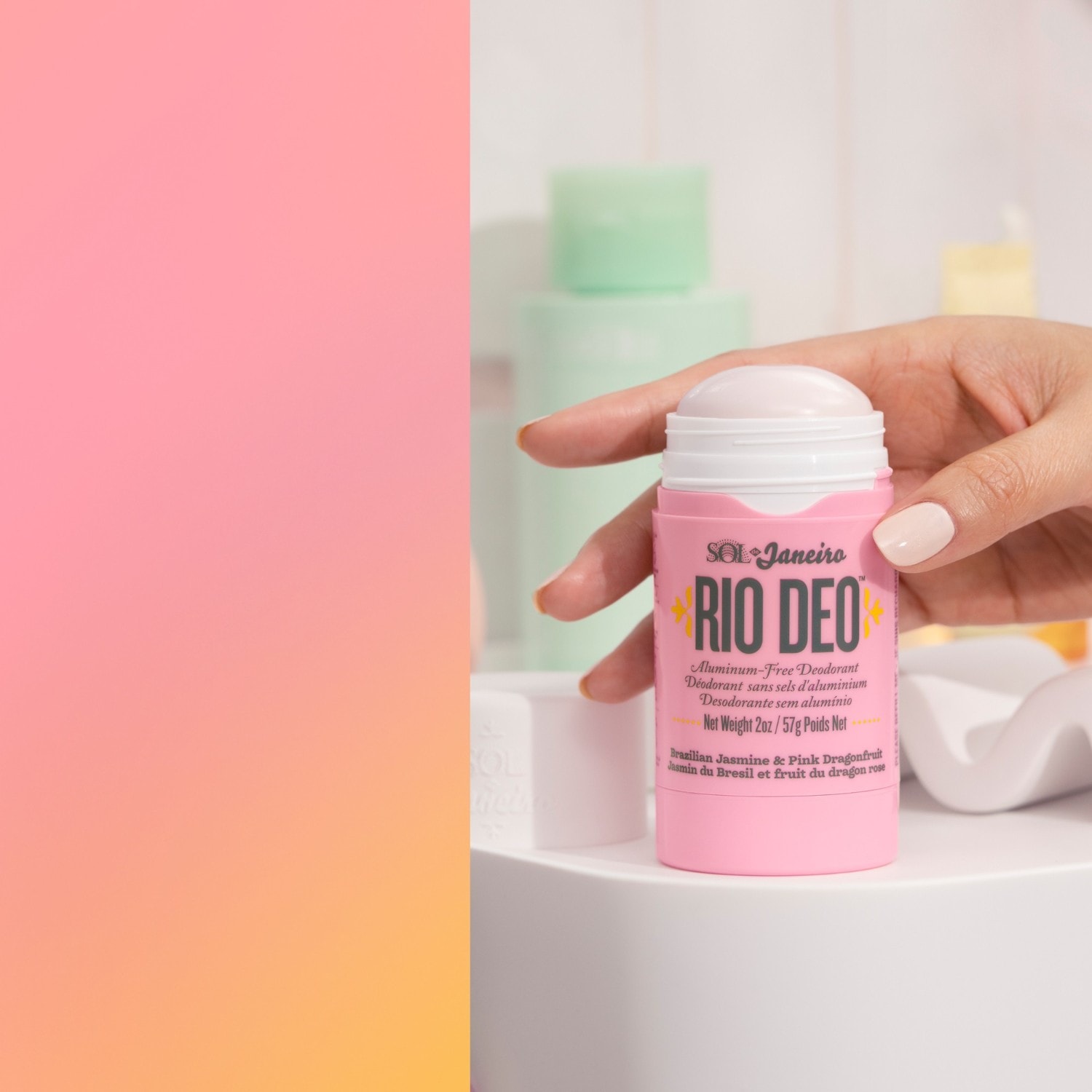 O desodorizante Rio da Sol de janeiro faz esquecer rapidamente os odores desagradáveis. O desodorizante sem alumínio e sem sódio vem com a fragrância floral frutada de Cheirosa '68, que mistura as delicadas notas de jasmim com o aroma da pitaya. A fórmula, enriquecida com enzima de mamão, óleo de coco, manteiga de bacuri e amido de tapioca, também tem propriedades calmantes. Além disso, o desodorizante Rio faz tudo para impedir o crescimento dos pêlos - por isso, não só deixa uma fragrância sedutora, como também promove a suavidade da pele fina das axilas.