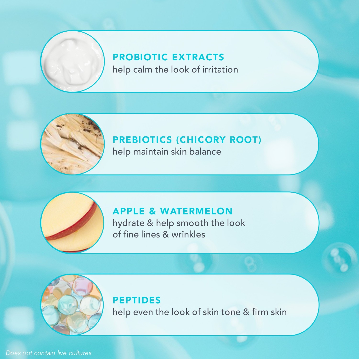 Cetyl Alcohol, Dimethicone, Hydrogenated Vegetable Oil, Lactococcus Ferment Lysate, Glyceryl Stearate, PEG-100 Stearate, Bifida Ferment Lysate, Lactose, Lactobacillus, Lactobacillus Ferment, Lactis proteinum/Milk Protein/Protéine du lait, Hydrolyzed Rice Protein, Collagen Amino Acids, Sodium Hyaluronate, Lactic Acid, Cichorium Intybus (Chicory) Root Extract, Alpha-Glucan Oligosaccharide, Vaccinium Angustifolium (Blueberry) Fruit Extract, Olus Oil/Vegetable Oil/Huile végétale, Camelina Sativa Seed Oil, Camellia Sinensis Leaf Extract, Curcuma Longa (Turmeric) Root Extract, Tocopheryl Acetate, Ascorbyl Palmitate, Olea Europaea (Olive) Fruit Oil, Pyrus Malus (Apple) Fruit Extract, Citrullus Lanatus (Watermelon) Fruit Extract, Lens Esculenta (Lentil) Fruit Extract, Inulin, Leuconostoc/Radish Root Ferment Filtrate, Beta Vulgaris (Beet) Root Extract/Beta Vulgaris/Extrait de racine de betterave, Polymnia Sonchifolia Root Juice, Sodium Lactate, Sodium PCA, Carbomer, Sodium Hydroxide, Pentylene Glycol, Ethylhexylglycerin, Stearyl Alcohol, Citric Acid, Phenethyl Alcohol, Sodium Benzoate, Potassium Sorbate, Phenoxyethanol, Trisodium Ethylenediamine Disuccinate, Sodium Chloride, Butylene Glycol, 1,2-Hexanediol, Maltodextrin, Fragrance (Parfum), Alpha-Isomethyl Ionone, Benzyl benzoate, Hexyl Cinnamal, Linalool
