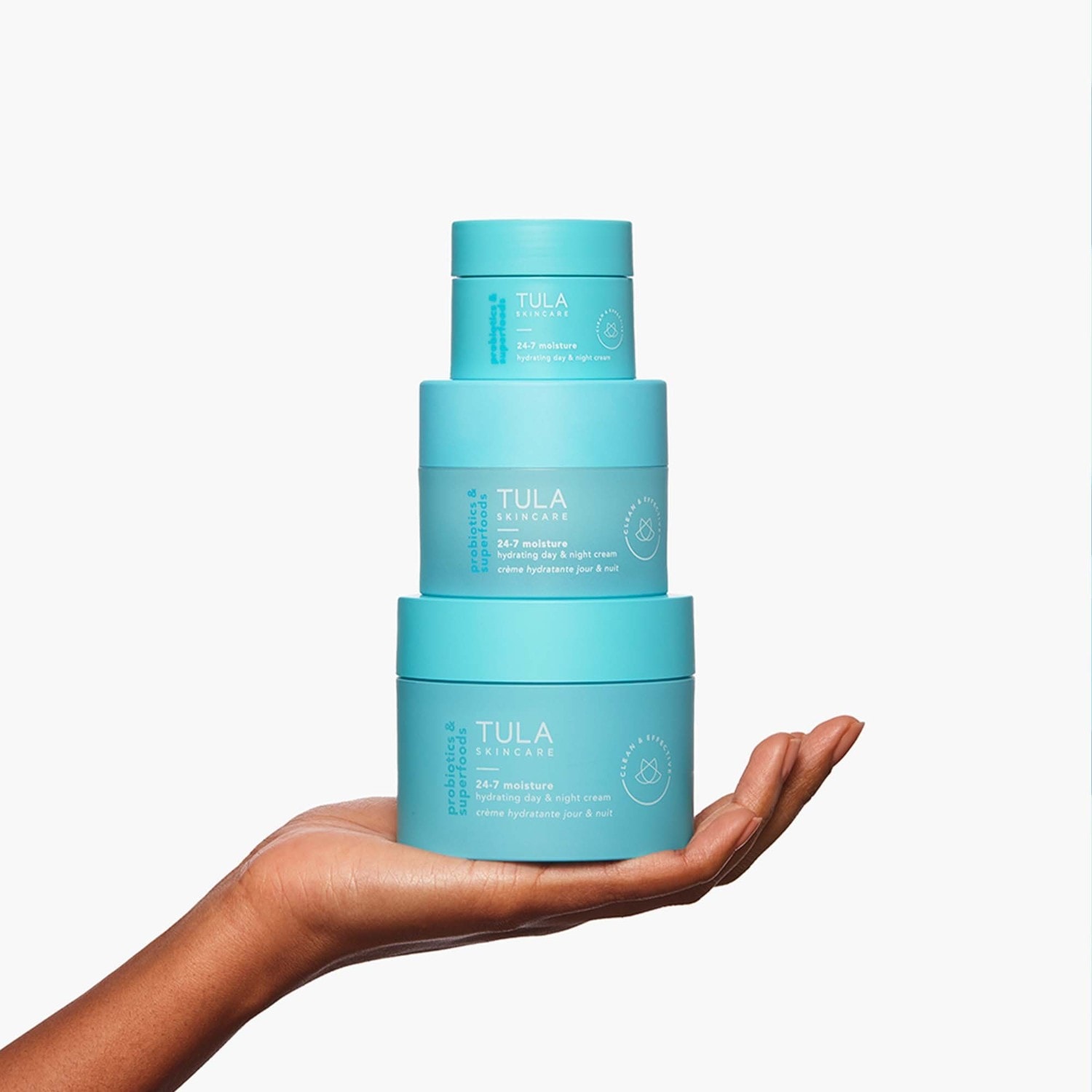 Comprovado clinicamente que hidrata em profundidade, o creme TULA 247 Dia e Noite de Hidratação é leve, não gorduroso, não comedogénico e ajuda a reavivar a pele desvanecida. O esqualano ajuda a nutrir a pele, enquanto os péptidos ajudam a uniformizá-la e a torná-la mais firme. Superalimentos tais como a maçã e a melancia hidratam e ajudam a suavizar o aparecimento de linhas e de rugas. De uso conjunto com os extratos probióticos e prebióticos caraterísticos TULA para ajudar a manter o equilíbrio da pele. Sem culturas vivas.