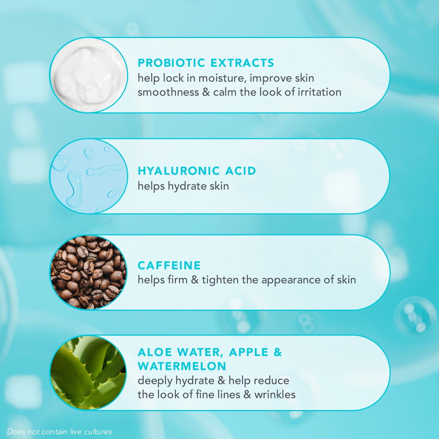 Aqua/Water/Eau, Propanediol, Aloe Barbadensis Leaf Juice, Sodium Stearate, Xylitol, Lactococcus Ferment Lysate, Synthetic Fluorphlogopite, Oleth-20, Glycerin, Caffeine, Citrullus Lanatus (Watermelon) Fruit Extract, Lens Esculenta (Lentil) Fruit Extract, Pyrus Malus (Apple) Fruit Extract, Hyaluronic Acid, Vaccinium Angustifolium (Blueberry) Fruit Extract) Lactic Acid, Tocopherol, Sodium PCA, Diphenyl Succinate, Menthone Glycerin Acetal, Menthyl Lactate, Capryloyl Glycerin/Sebacic Acid Copolymer, Xanthan Gum, Sodium Lactate, Tin Oxide, Sodium Chloride, Ethylhexylglycerin, Phenoxyethanol, Sodium Benzoate, Potassium Sorbate, Titanium Dioxide (CI 77891), Blue 1 (CI 42090), Yellow 5 (CI 19140)