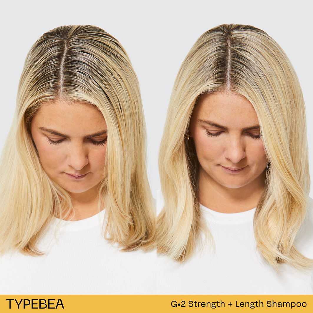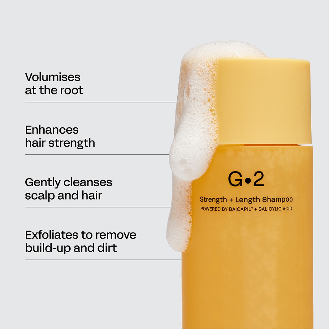 Solte o Cabelo. Molhe-o. Aplique o champô no couro cabeludo e cabelo, massajar até fazer espuma e depois enxaguar. Aplicar em seguida o Condicionador G3 Strength & Length e o G1 Overnight Boosting Peptide Serum para favorecer o crescimento do cabelo.